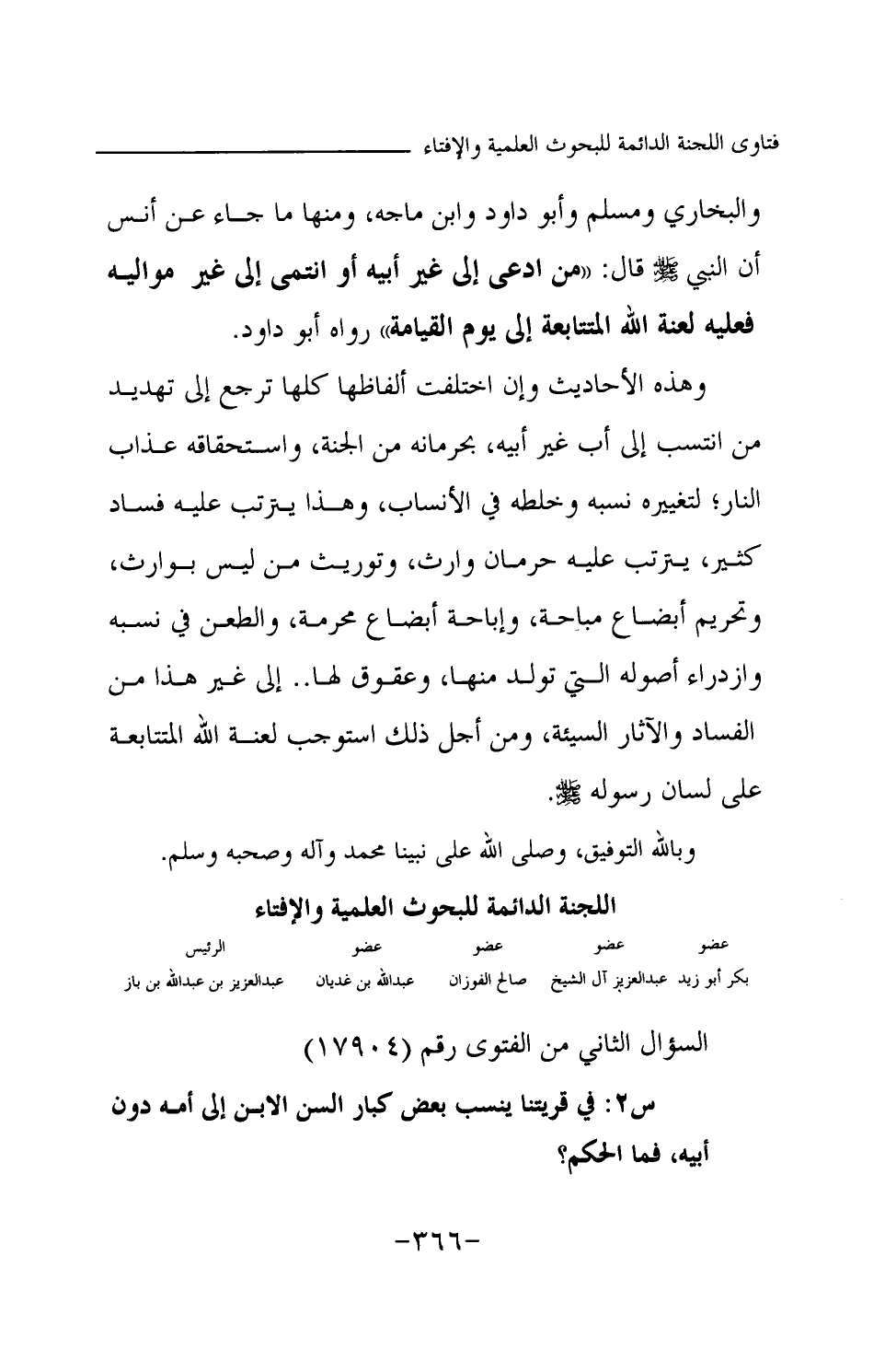 رواه أحمد والبخاري ومسلم وأبو داود وابن ماجه ومنها ما جاء عن أنس أن النبي صلى الله عليه وسلم قال: «من ادعى إلى غير أبيه أو انتمى إلى غير مواليه فعليه لعنة الله المتتابعة إلى يوم القيامة» رواه أبو داود. وهذه الأحاديث وإن اختلفت ألفاظها كلها ترجع إلى تهديد من انتسب إلى أب غير أبيه، بحرمانه من الجنة، واستحقاقه عذاب النار، لتغييره نسبه وخلطه في الأنساب، وهذا يترتب عليه فساد كثير، يترتب عليه حرمان وارث، وتوريث من ليس بوارث، وتحريم أبضاع مباحة، وإباحة أبضاع محرمة، والطعن في نسبه وازدراء أصوله التي تولد منها، وعقوق لها.. إلى غير هذا من الفساد والآثار السيئة، ومن أجل ذلك استوجب لعنة الله المتتابعة على لسان رسوله صلى الله عليه وسلم. وبالله التوفيق، وصلى الله على نبينا محمد وآله وصحبه وسلم.