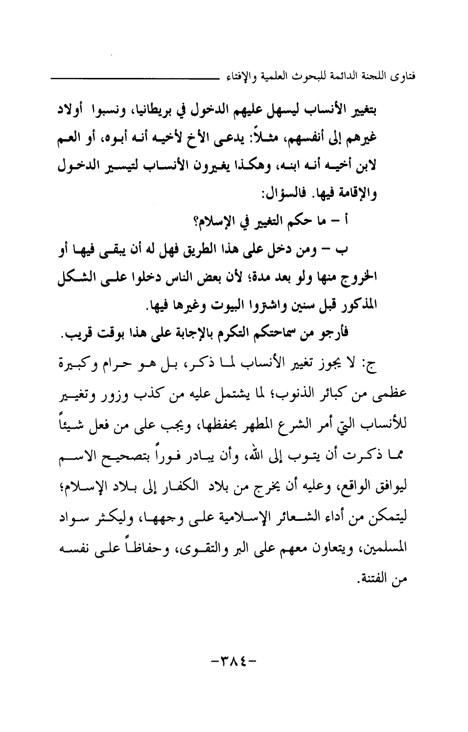 ج: لا يجوز تغيير الأنساب لما ذكر، بل هو حرام وكبيرة عظمى من كبائر الذنوب؟ لما يشتمل عليه من كذب وزور وتغيير للأنساب التي أمر الشرع المطهر بحفظها، ويجب على من فعل شيئا مما ذكرت أن يتوب إلى الله، وأن يبادر فورا بتصحيح الاسم ليوافق الواقع، وعليه أن يخرج من بلاد الكفار إلى بلاد الإسلام؛ ليتمكن من أداء الشعائر الإسلامية على وجهها، وليكثر سواد المسلمين، ويتعاون معهم على البر والتقوى، وحفاظا على نفسه من الفتنة.