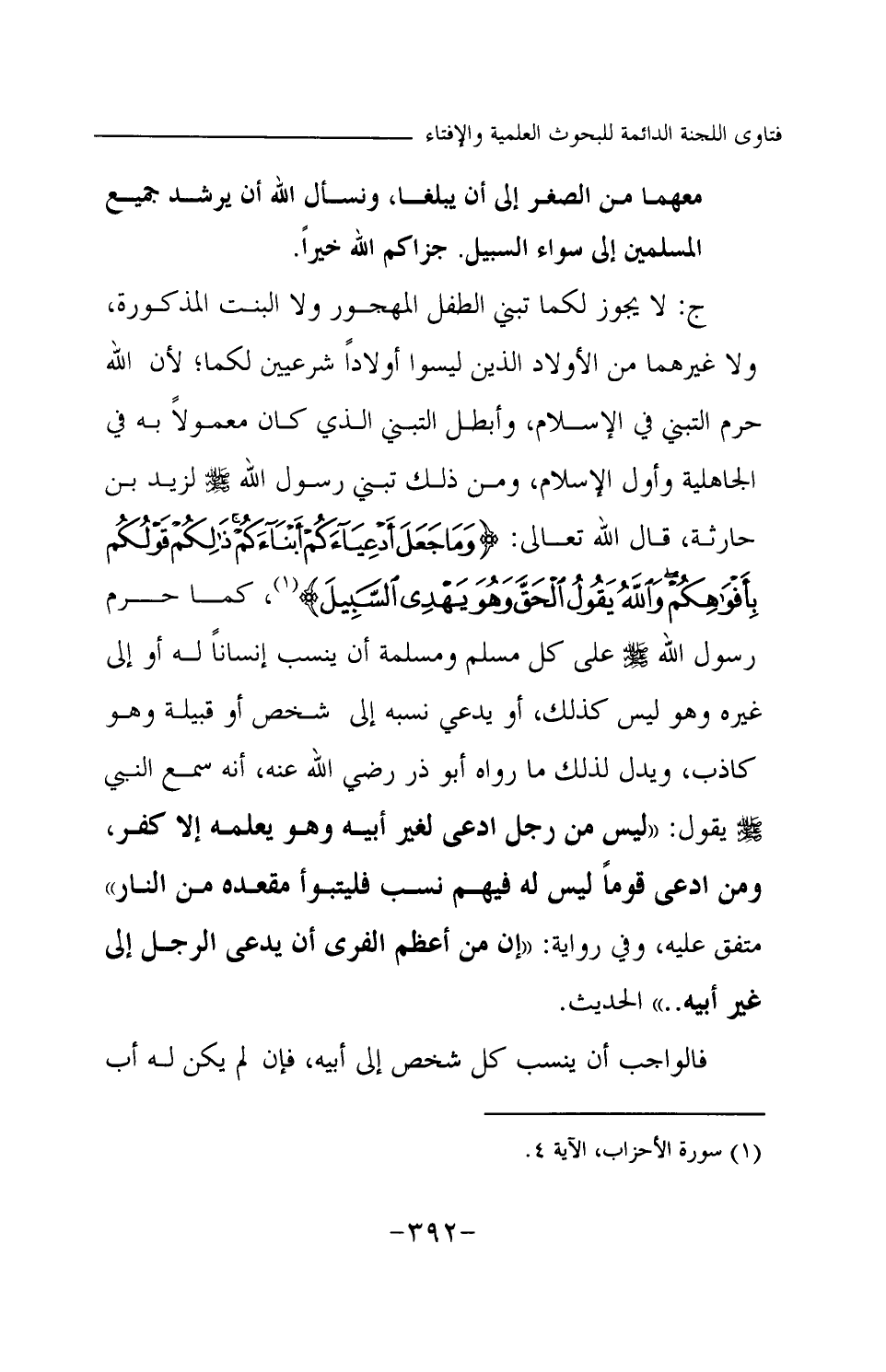 ج: لا يجوز لكما تبني الطفل المهجور ولا البنت المذكورة، ولا غيرهما من الأولاد الذين ليسوا أولادا شرعيين لكما؛ لأن الله حرم التبني في الإسلام، وأبطل التبني الذي كان معمولا به في الجاهلية وأول الإسلام، ومن ذلك تبني رسول الله صلى الله عليه وسلم لزيد بن حارثة قال الله تعالى: {وَمَا جَعَلَ أَدْعِيَاءَكُمْ أَبْنَاءَكُمْ ذَلِكُمْ قَوْلُكُمْ بِأَفْوَاهِكُمْ وَاللَّهُ يَقُولُ الْحَقَّ وَهُوَ يَهْدِي السَّبِيلَ} (¬1) كما حرم رسول الله صلى الله عليه وسلم على كل مسلم ومسلمة أن ينسب إنسانا له أو إلى غيره وهو ليس كذلك، أو يدعي نسبه إلى شخص أو قبيلة وهو كاذب، ويدل لذلك ما رواه أبو ذر رضي الله عنه، أنه سمع النبي صلى الله عليه وسلم يقول: «ليس من رجل ادعى لغير أبيه وهو يعلمه إلا كفر، ومن ادعى قوما ليس له فيهم نسب فليتبوأ مقعده من النار (¬2) » متفق عليه وفي رواية: «إن من أعظم الفرى أن يدعى الرجل إلى غير أبيه (¬3) » . . . الحديث. فالواجب أن ينسب كل شخص إلى أبيه، فإن لم يكن له أب