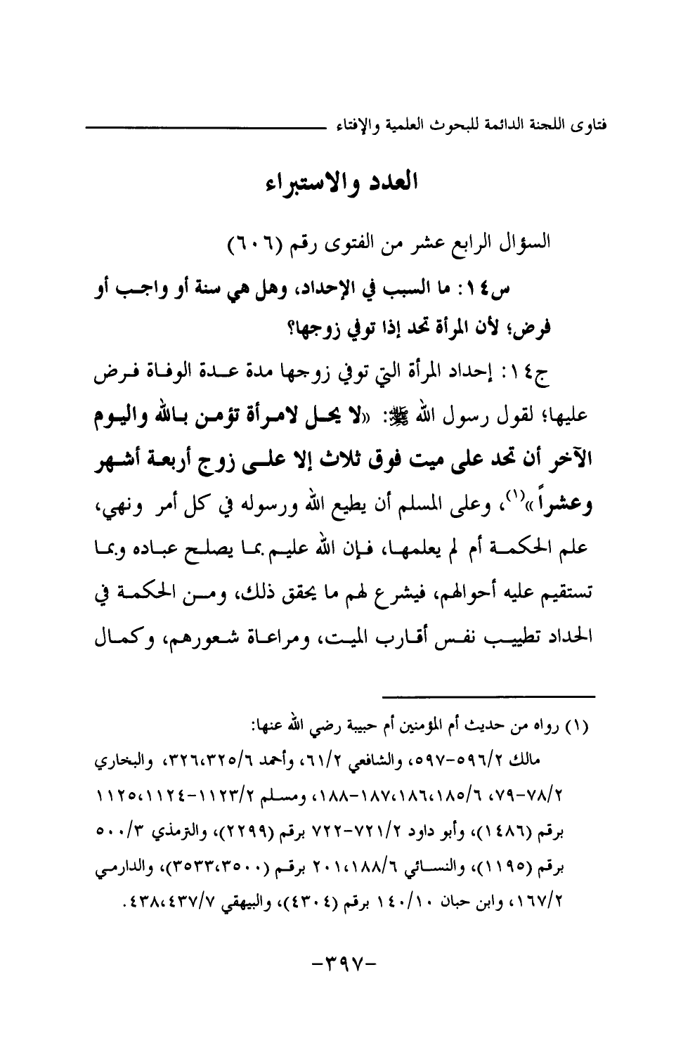 ج 14: إحداد المرأة التي توفي زوجها مدة عدة الوفاة فرض عليها؛ لقول رسول الله صلى الله عليه وسلم: «لا يحل لامرأة تؤمن بالله واليوم الآخر أن تحد على ميت فوق ثلاث إلا على زوج أربعة أشهر وعشرا (¬1) » وعلى المسلم أن يطيع الله ورسوله في كل أمر ونهي، علم الحكمة أم لم يعلمها، فإن الله عليم بما يصلح عباده وبما تستقيم عليه أحوالهم، فيشرع لهم ما يحقق ذلك، ومن الحكمة في الحداد تطيب نفس أقارب الميت، ومراعاة شعورهم، وكمال