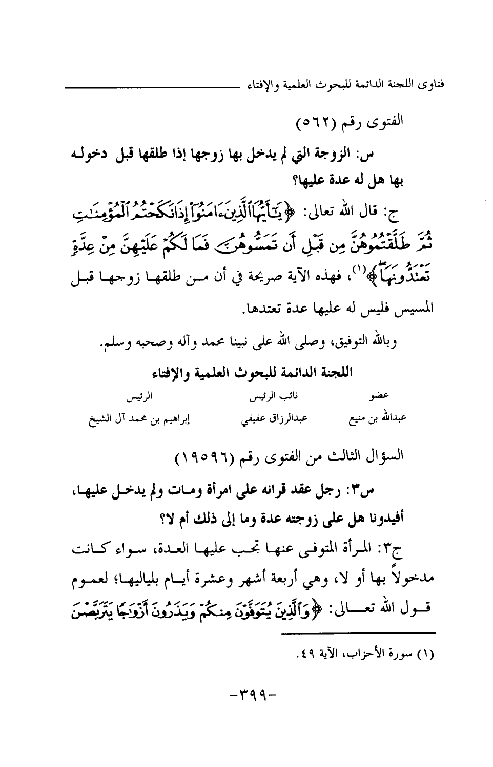 ج: قال الله تعالى: {يَا أَيُّهَا الَّذِينَ آمَنُوا إِذَا نَكَحْتُمُ الْمُؤْمِنَاتِ ثُمَّ طَلَّقْتُمُوهُنَّ مِنْ قَبْلِ أَنْ تَمَسُّوهُنَّ فَمَا لَكُمْ عَلَيْهِنَّ مِنْ عِدَّةٍ تَعْتَدُّونَهَا} (¬1) فهذه الآية صريحة في أن من طلقها زوجها قبل المسيس فليس له عليها عدة تعتدها. وبالله التوفيق، وصلى الله على نبينا محمد وآله وصحبه وسلم.