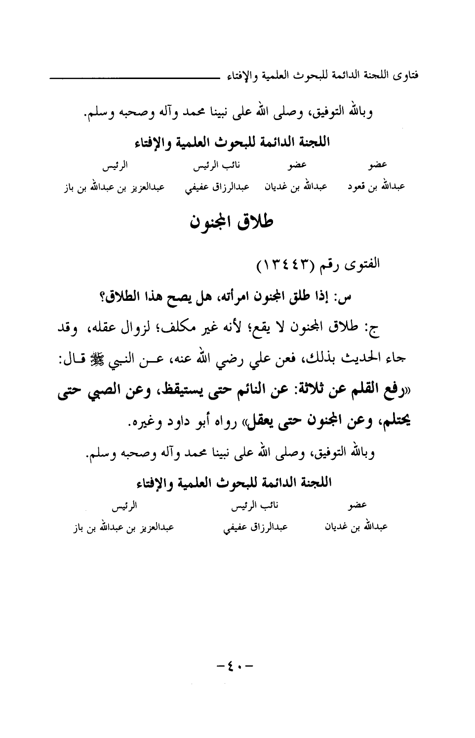 ج: طلاق المجنون لا يقع؛ لأنه غير مكلف؛ لزوال عقله، وقد جاء الحديث بذلك، فعن علي -رضي الله عنه-، عن النبي -صلى الله عليه وسلم- قال: «رفع القلم عن ثلاثة: عن النائم حتى يستيقظ، وعن الصبي حتى يحتلم، وعن المجنون حتى يعقل (¬1) » رواه أبو داود وغيره. وبالله التوفيق، وصلى الله على نبينا محمد وآله وصحبه وسلم.