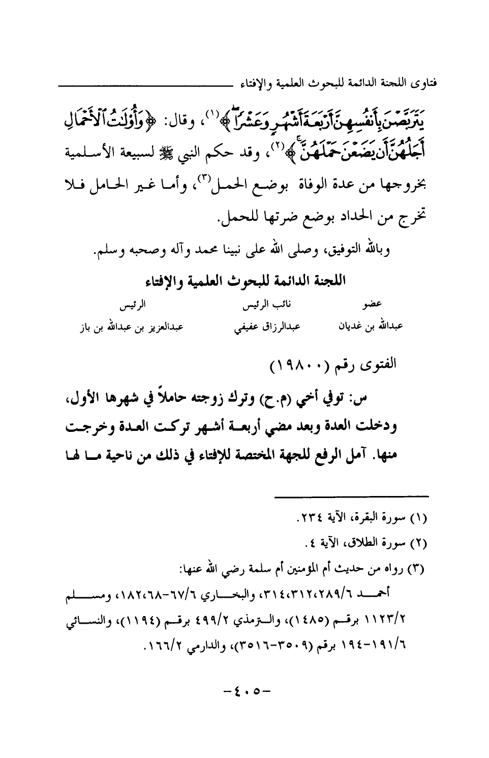 وقال: {وَأُولَاتُ الْأَحْمَالِ أَجَلُهُنَّ أَنْ يَضَعْنَ حَمْلَهُنَّ} (¬1) «وقد حكم النبي -صلى الله عليه وسلم- لسبيعة الأسلمية بخروجها من عدة الوفاة بوضع الحمل (¬2) » وأما غير الحامل فلا تخرج من الحداد بوضع ضرتها للحمل. وبالله التوفيق، وصلى الله على نبينا محمد وآله وصحبه وسلم.