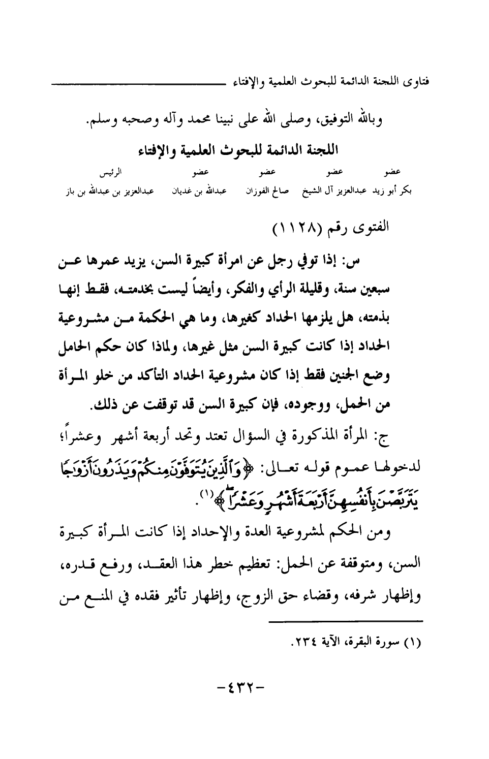 ج: المرأة المذكورة في السؤال تعتد وتحد أربعة أشهر وعشرا، لدخولها عموم قوله تعالى: {وَالَّذِينَ يُتَوَفَّوْنَ مِنْكُمْ وَيَذَرُونَ أَزْوَاجًا يَتَرَبَّصْنَ بِأَنْفُسِهِنَّ أَرْبَعَةَ أَشْهُرٍ وَعَشْرًا} (¬1) ومن الحكم لمشروعية العدة والإحداد إذا كانت المرأة كبيرة السن، ومتوقفة عن الحمل: تعظيم خطر هذا العقد، ورفع قدره، وإظهار شرفه، وقضاء حق الزوج، وإظهار تأثير فقده في المنع من