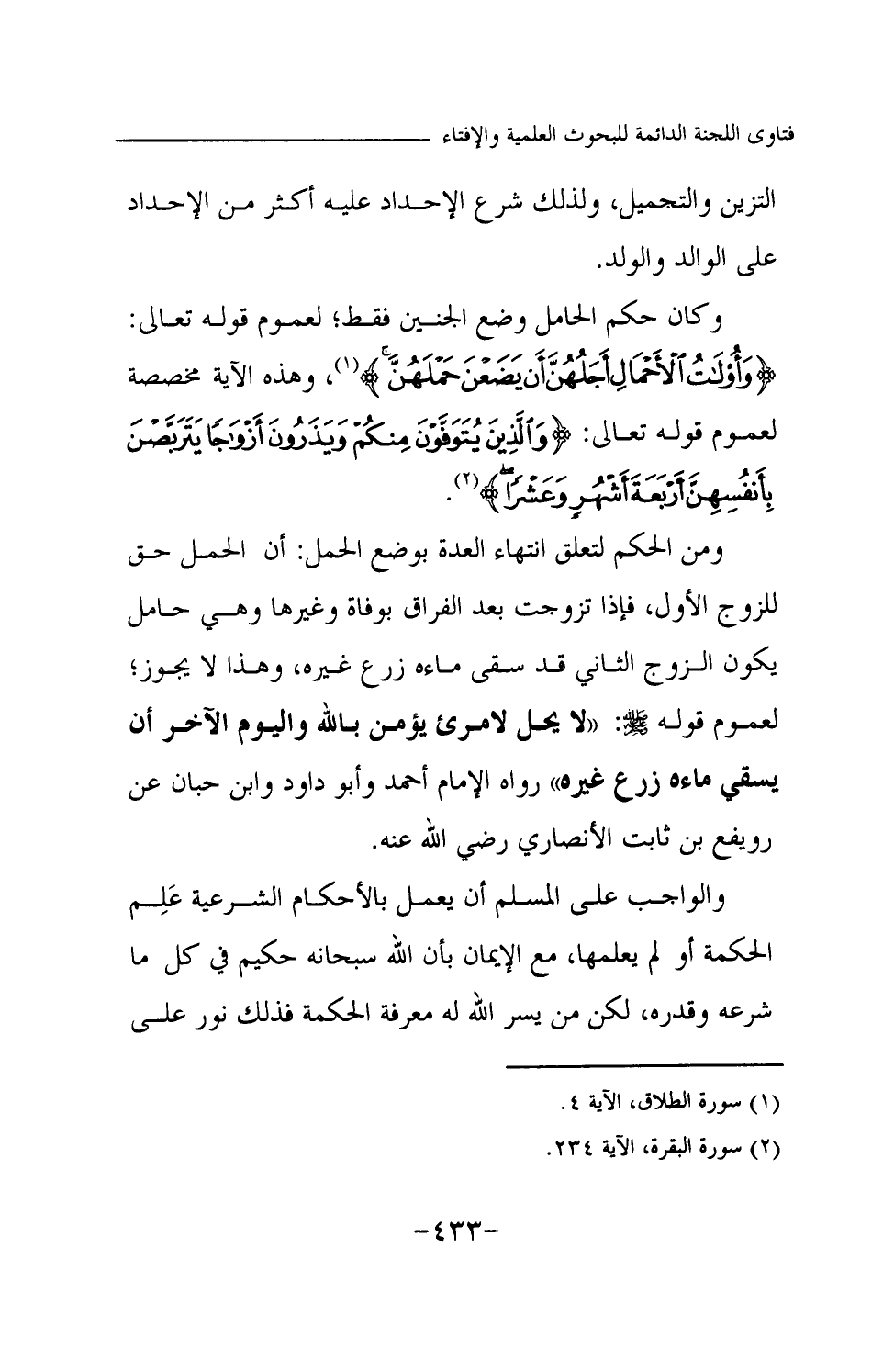 التزين والتجميل، ولذلك شرع الإحداد عليه أكثر من الإحداد على الوالد والولد. وكان حكم الحامل وضع الجنين فقط؛ لعموم قوله تعالى: {وَأُولَاتُ الْأَحْمَالِ أَجَلُهُنَّ أَنْ يَضَعْنَ حَمْلَهُنَّ} (¬1) وهذه الآية مخصصة لعموم قوله تعالى: {وَالَّذِينَ يُتَوَفَّوْنَ مِنْكُمْ وَيَذَرُونَ أَزْوَاجًا يَتَرَبَّصْنَ بِأَنْفُسِهِنَّ أَرْبَعَةَ أَشْهُرٍ وَعَشْرًا} (¬2) ومن الحكم لتعلق انتهاء العدة بوضع الحمل: أن الحمل حق للزوج الأول، فإذا تزوجت بعد الفراق بوفاة وغيرها وهي حامل يكون الزوج الثاني قد سقى ماءه زرع غيره، وهذا لا يجوز؛ لعموم قوله -صلى الله عليه وسلم-: «لا يحل لامرئ يؤمن بالله واليوم الآخر أن يسقي ماءه زرع غيره (¬3) » رواه الإمام أحمد وأبو داود وابن حبان عن رويفع بن ثابت الأنصاري رضي الله عنه. والواجب على المسلم أن يعمل بالأحكام الشرعية علم الحكمة أو لم يعلمها، مع الإيمان بأن الله سبحانه حكيم في كل ما شرعه وقدره، لكن من يسر الله له معرفة الحكمة فذلك نور على