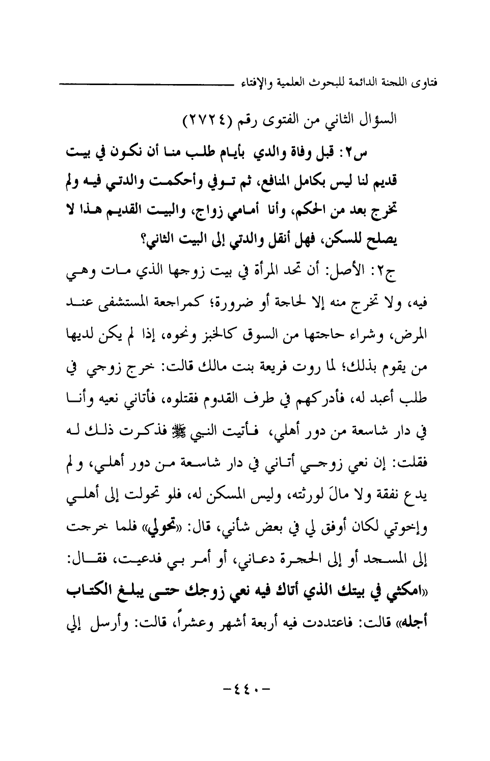 ج2: الأصل: أن تحد المرأة في بيت زوجها الذي مات وهي فيه، ولا تخرج منه إلا لحاجة أو ضرورة؛ كمراجعة المستشفى عند المرض، وشراء حاجتها من السوق كالخبز ونحوه، إذا لم يكن لديها من يقوم بذلك؛ لما روت فريعة بنت مالك قالت: «خرج زوجي في طلب أعبد له، فأدركهم في طرف القدوم فقتلوه، فأتاني نعيه وأنا في دار شاسعة من دور أهلي، فأتيت النبي -صلى الله عليه وسلم- فذكرت ذلك له فقلت: إن نعي زوجي أتاني في دار شاسعة من دور أهلي، ولم يدع نفقة ولا مال لورثته، وليس المسكن له، فلو تحولت إلى أهلي وإخوتي لكان أوفق لي في بعض شأني، قال: تحولي، فلما خرجت إلى المسجد أو إلى الحجرة دعاني، أو أمر بي فدعيت، فقال: امكثي في بيتك الذي أتاك فيه نعي زوجك حتى يبلغ الكتاب أجله. قالت: فاعتددت فيه أربعة أشهر وعشرا، قالت: وأرسل إلي عثمان فأخبرته فأخذ به (¬1) »