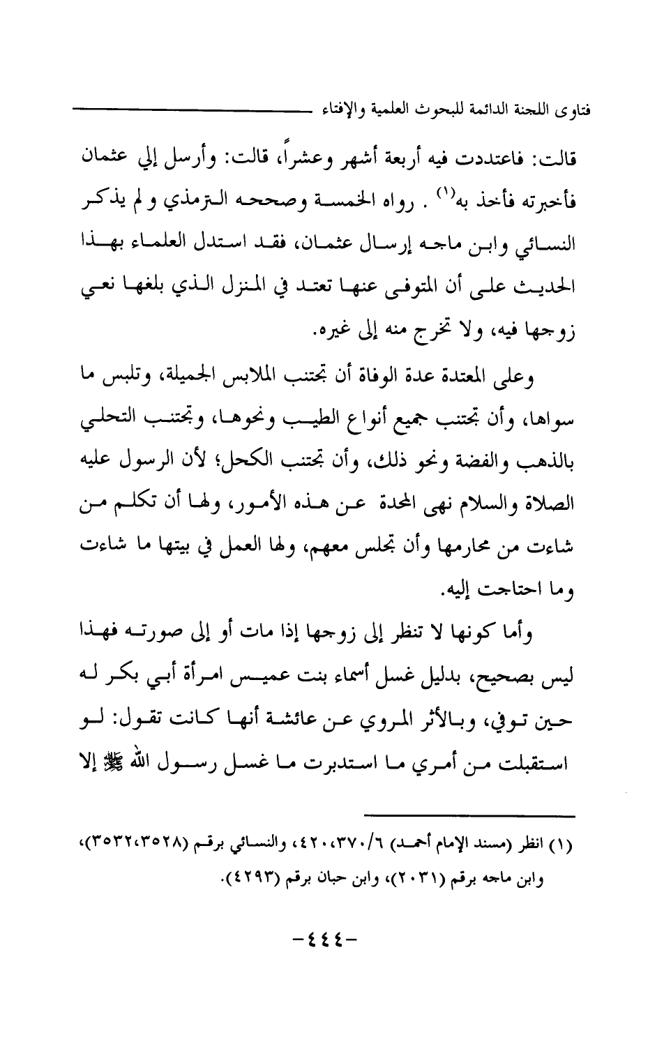 رواه الخمسة وصححه الترمذي ولم يذكر النسائي وابن ماجه إرسال عثمان فقد استدل العلماء بهذا الحديث على أن المتوفى عنها تعتد في المنزل الذي بلغها نعي زوجها فيه، ولا تخرج منه إلى غيره. وعلى المعتدة عدة الوفاة أن تجتنب الملابس الجميلة، وتلبس ما سواها، وأن تجتنب جميع أنواع الطيب ونحوها، وتجتنب التحلي بالذهب والفضة ونحو ذلك، وأن تجتنب الكحل؛ لأن الرسول -عليه الصلاة والسلام- نهى المحدة عن هذه الأمور، ولها أن تكلم من شاءت من محارمها وأن تجلس معهم، ولها العمل في بيتها ما شاءت وما احتاجت إليه. وأما كونها لا تنظر إلى زوجها إذا مات أو إلى صورته فهذا ليس بصحيح، بدليل غسل أسماء بنت عميس امرأة أبي بكر له حين توفي، وبالأثر المروي عن عائشة أنها كانت تقول: «لو استقبلت من أمري ما استدبرت ما غسل رسول الله -صلى الله عليه وسلم- إلا نساؤه (¬1) » .