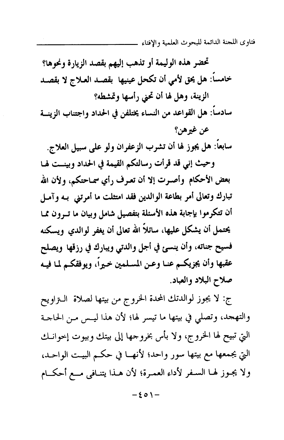 وحيث إني قد قرأت رسالتكم القيمة في الحداد وبينت لها بعض الأحكام وأصرت إلا أن تعرف رأي سماحتكم، ولأن الله تبارك وتعالى أمر بطاعة الوالدين فقد امتثلت ما أمرتني به وآمل أن تتكرموا بإجابة هذه الأسئلة بتفصيل شامل وبيان ما ترون مما يحتمل أن يشكل عليها، سائلا الله تعالى أن يغفر لوالدي ويسكنه فسيح جناته، وأن ينسئ في أجل والدتي ويبارك في رزقها ويصلح عقبها وأن يجزيكم عنا وعن المسلمين خيرا، ويوفقكم لما فيه صلاح البلاد والعباد.
