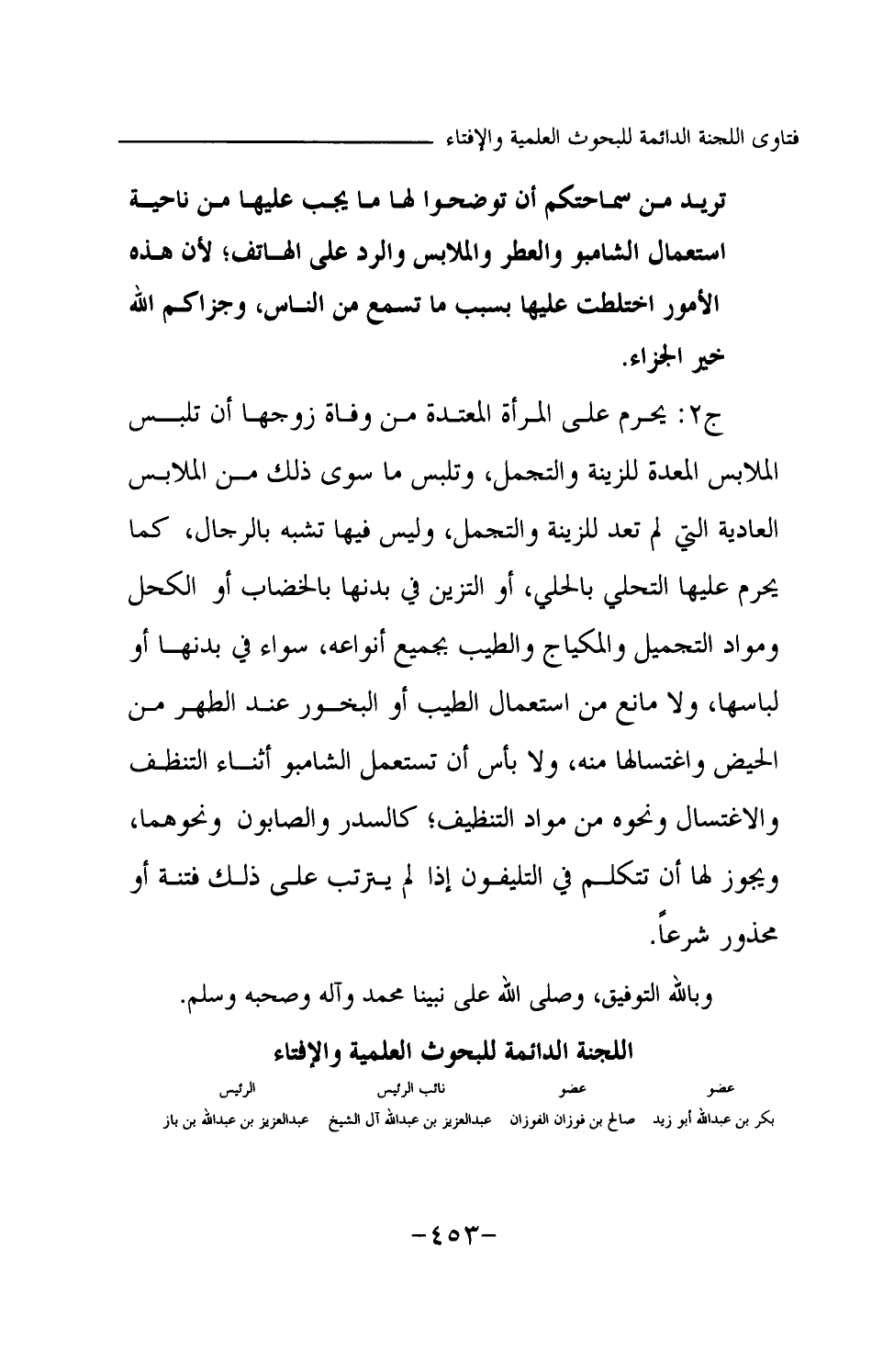 ج2: يحرم على المرأة المعتدة من وفاة زوجها أن تلبس الملابس المعدة للزينة والتجمل، وتلبس ما سوى ذلك من الملابس العادية التي لم تعد للزينة والتجمل، وليس فيها تشبه بالرجال، كما يحرم عليها التحلي بالحلي، أو التزين في بدنها بالخضاب أو الكحل ومواد التجميل والمكياج والطيب بجميع أنواعه، سواء في بدنها أو لباسها، ولا مانع من استعمال الطيب أو البخور عند الطهر من الحيض واغتسالها منه، ولا بأس أن تستعمل الشامبو أثناء التنظف والاغتسال ونحوه من مواد التنظف؛ كالسدر والصابون ونحوهما، ويجوز لها أن تتكلم في التليفون إذا لم يترتب على ذلك فتنة أو محذور شرعا. وبالله التوفيق، وصلى الله على نبينا محمد وآله وصحبه وسلم.