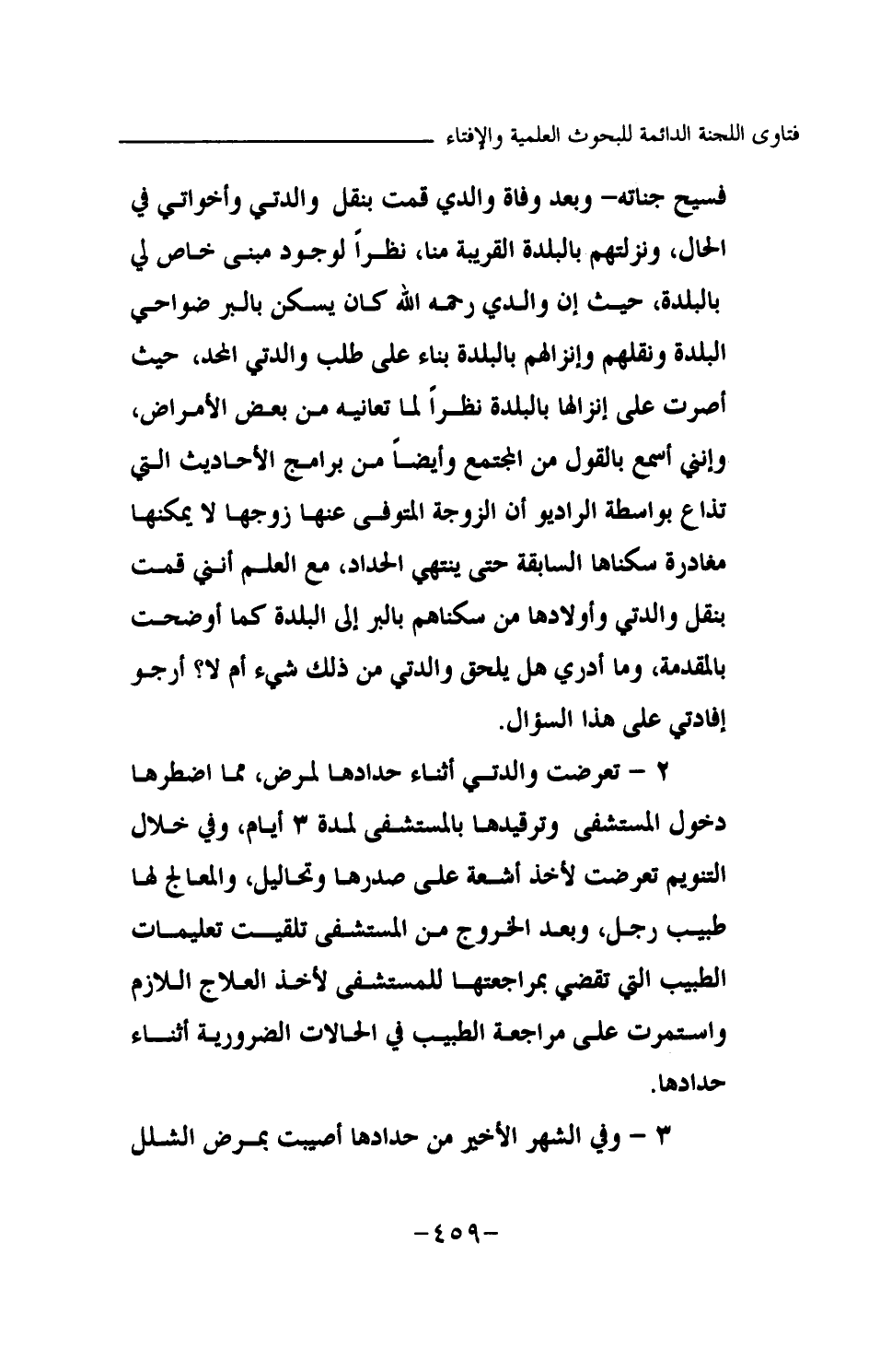 فسيح جناته- وبعد وفاة والدي قمت بنقل والدتي وأخواتي في الحال، ونزلتهم بالبلدة القريبة منا؛ نظرا لوجود مبنى خاص لي بالبلدة، حيث إن والدي رحمه الله كان يسكن بالبر ضواحي البلدة ونقلهم وإنزالهم بالبلدة بناء على طلب والدتي المحد، حيث أصرت على إنزالها بالبلدة نظرا لما تعانيه من بعض الأمراض، وإنني أسمع بالقول من المجتمع وأيضا من برامج الأحاديث التي تذاع بواسطة الراديو أن الزوجة المتوفى عنها زوجها لا يمكنها مغادرة سكناها السابقة حتى ينتهي الحداد، مع العلم أنني قمت بنقل والدتي وأولادها من سكناهم بالبر إلى البلدة كما أوضحت بالمقدمة، وما أدري هل يلحق والدتي من ذلك شيء أم لا؟ أرجو إفادتي على هذا السؤال. 2- تعرضت والدتي أثناء حدادها لمرض، مما اضطرها دخول المستشفى وترقيدها بالمستشفى لمدة 3 أيام، وفي خلال التنويم تعرضت لأخذ أشعة على صدرها وتحاليل، والمعالج لها طبيب رجل، وبعد الخروج من المستشفى تلقيت تعليمات الطبيب التي تقضي بمراجعتها للمستشفى لأخذ العلاج اللازم واستمرت على مراجعة الطبيب في الحالات الضرورية أثناء حدادها. 3- وفي الشهر الأخير من حدادها أصيبت بمرض الشلل