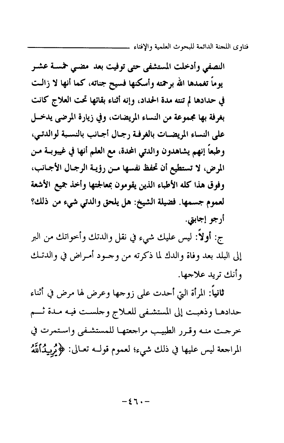 النصفي وأدخلت المستشفى حتى توفيت بعد مضي خمسة عشر يوما تغمدها الله برحمته وأسكنها فسيح جناته، كما أنها لا زالت في حدادها لم تنته مدة الحداد، وإنه أثناء بقائها تحت العلاج كانت بغرفة بها مجموعة من النساء المريضات، وفي زيارة المرضى يدخل على النساء المريضات بالغرفة رجال أجانب بالنسبة لوالدتي، وطبعا إنهم يشاهدون والدتي المحدة، مع العلم أنها في غيبوبة من المرض، لا تستطيع أن تحفظ نفسها من رؤية الرجال الأجانب، وفوق هذا كله الأطباء الذين يقومون بمعالجتها وأخذ جميع الأشعة لعموم جسمها. فضيلة الشيخ: هل يلحق والدتي شيء من ذلك؟