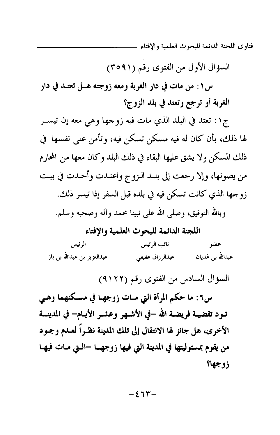 س6: ما حكم المرأة التي مات زوجها في مسكنهما وهي تود تقضية فريضة الله -في الأشهر وعشر الأيام- في المدينة الأخرى، هل جائز لها الانتقال إلى تلك المدينة نظرا لعدم وجود من يقوم بمسئوليتها في المدينة التي فيها زوجها (التي مات فيها زوجها) ؟