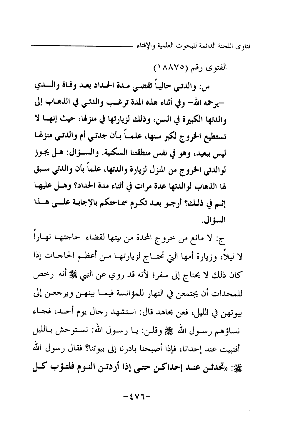 ج: لا مانع من خروج المحدة من بيتها لقضاء حاجتها نهارا لا ليلا، وزيارة أمها التي تحتاج لزيارتها من أعظم الحاجات إذا كان ذلك لا يحتاج إلى سفر؛ لأنه قد روي عن النبي -صلى الله عليه وسلم- أنه رخص للمحدات أن يجتمعن في النهار للمؤانسة فيما بينهن ويرجعن إلى بيوتهن في الليل، فعن مجاهد قال: استشهد رجال يوم أحد فجاء نساؤهم رسول الله -صلى الله عليه وسلم- وقلن: «يا رسول الله، نستوحش بالليل أفنبيت عند إحدانا، فإذا أصبحنا بادرنا إلى بيوتنا؟ فقال رسول الله -صلى الله عليه وسلم-: تحدثن عند إحداكن حتى إذا أردتن النوم فلتؤب كل واحدة إلى بيتها» (¬1)