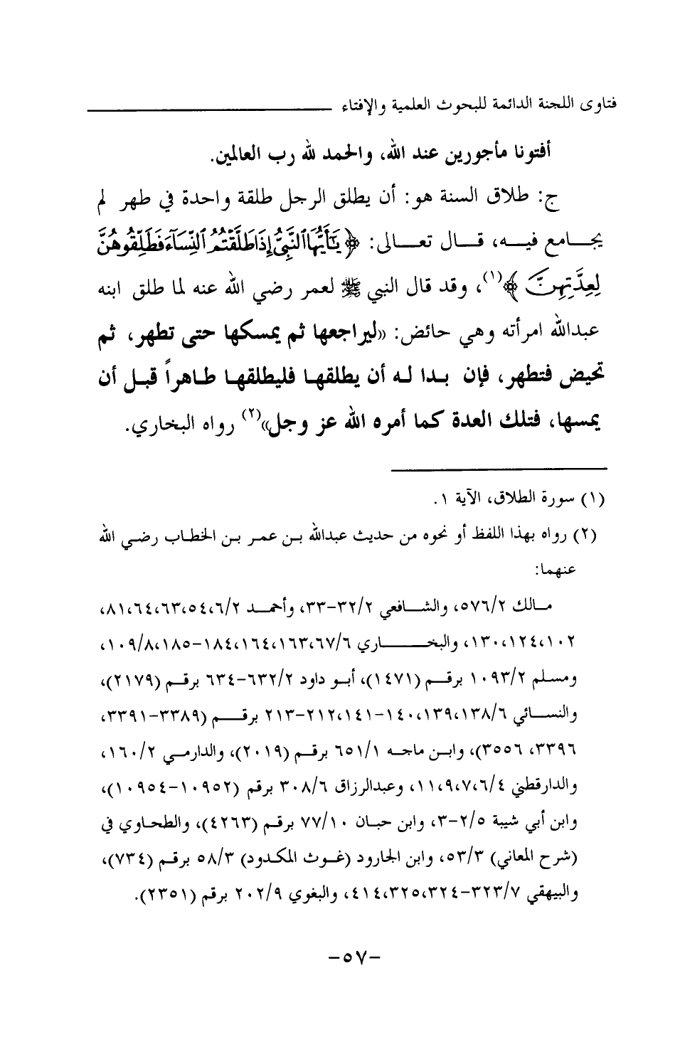 ج: طلاق السنة هو: أن يطلق الرجل طلقة واحدة في طهر لم يجامع فيه، قال تعالى: {يَا أَيُّهَا النَّبِيُّ إِذَا طَلَّقْتُمُ النِّسَاءَ فَطَلِّقُوهُنَّ لِعِدَّتِهِنَّ} (¬1) وقد قال النبي -صلى الله عليه وسلم- لعمر رضي الله عنه لما طلق ابنه عبد الله امرأته وهي حائض: «ليراجعها ثم يمسكها حتى تطهر، ثم تحيض فتطهر، فإن بدا له أن يطلقها فليطلقها طاهرا قبل أن يمسها، فتلك العدة كما أمره الله عز وجل (¬2) » رواه البخاري.