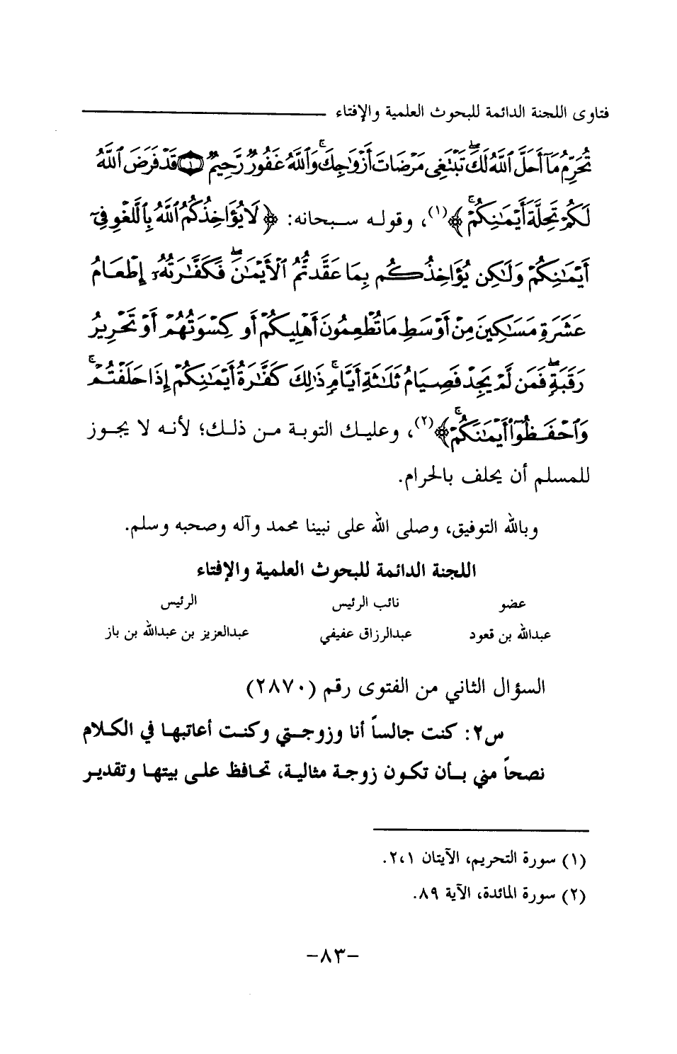 {يَا أَيُّهَا النَّبِيُّ لِمَ تُحَرِّمُ مَا أَحَلَّ اللَّهُ لَكَ تَبْتَغِي مَرْضَاتَ أَزْوَاجِكَ وَاللَّهُ غَفُورٌ رَحِيمٌ} (¬1) {قَدْ فَرَضَ اللَّهُ لَكُمْ تَحِلَّةَ أَيْمَانِكُمْ} (¬2) وقوله سبحانه: {لَا يُؤَاخِذُكُمُ اللَّهُ بِاللَّغْوِ فِي أَيْمَانِكُمْ وَلَكِنْ يُؤَاخِذُكُمْ بِمَا عَقَّدْتُمُ الْأَيْمَانَ فَكَفَّارَتُهُ إِطْعَامُ عَشَرَةِ مَسَاكِينَ مِنْ أَوْسَطِ مَا تُطْعِمُونَ أَهْلِيكُمْ أَوْ كِسْوَتُهُمْ أَوْ تَحْرِيرُ رَقَبَةٍ فَمَنْ لَمْ يَجِدْ فَصِيَامُ ثَلَاثَةِ أَيَّامٍ ذَلِكَ كَفَّارَةُ أَيْمَانِكُمْ إِذَا حَلَفْتُمْ وَاحْفَظُوا أَيْمَانَكُمْ} (¬3) وعليك التوبة من ذلك؛ لأنه لا يجوز للمسلم أن يحلف بالحرام. وبالله التوفيق، وصلى الله على نبينا محمد وآله وصحبه وسلم.