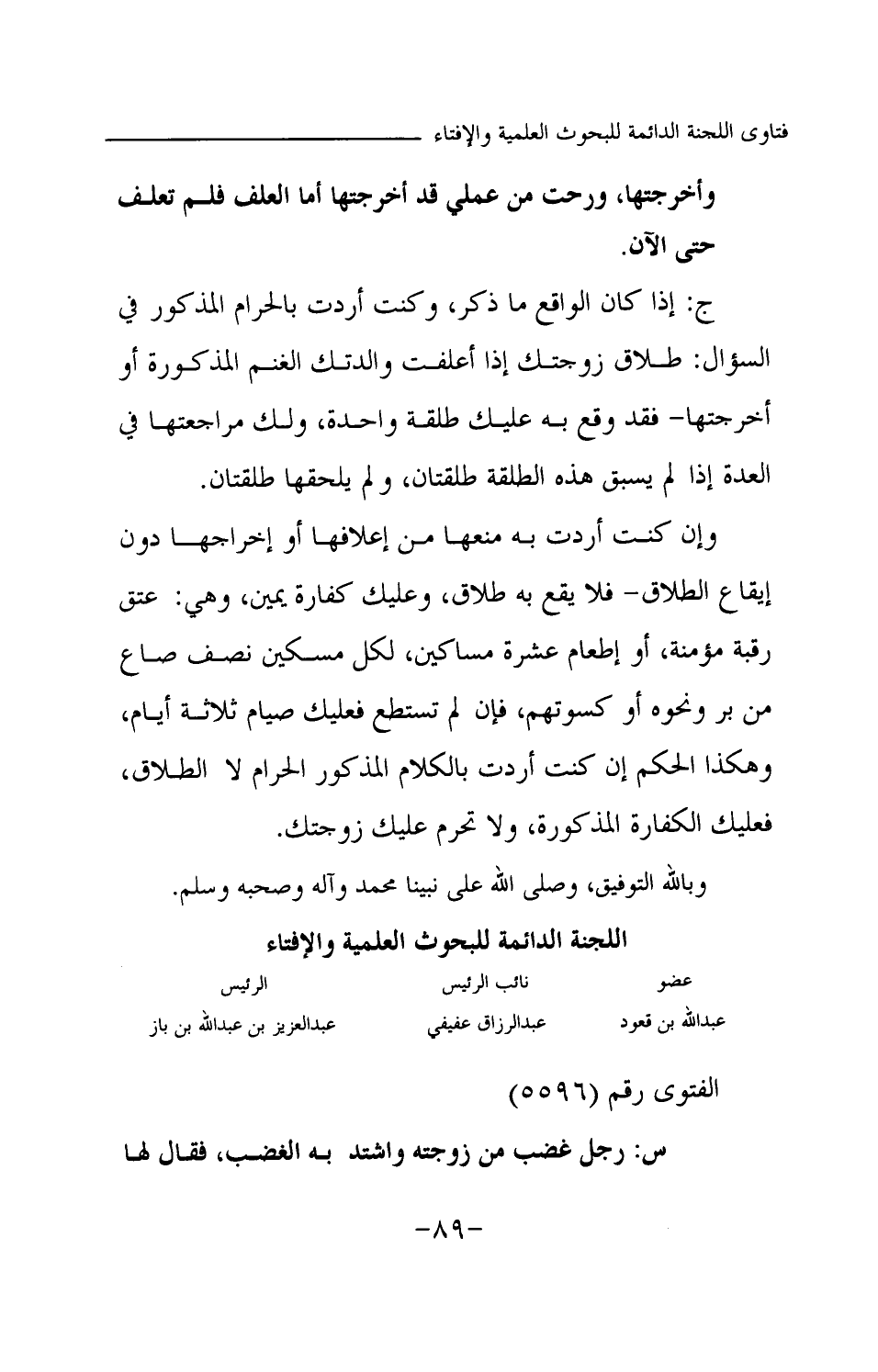 ج: إذا كان الواقع ما ذكر، وكنت أردت بالحرام المذكور في السؤال: طلاق زوجتك إذا أعلفت والدتك الغنم المذكورة أو أخرجتها - فقد وقع به عليك طلقة واحدة، ولك مراجعتها في العدة إذا لم يسبق هذه الطلقة طلقتان، ولم يلحقها طلقتان. وإن كنت أردت به منعها من إعلافها أو إخراجها دون إيقاع الطلاق- فلا يقع به طلاق، وعليك كفارة يمين، وهي: عتق رقبة مؤمنة، أو إطعام عشرة مساكين، لكل مسكين نصف صاع من بر ونحوه أو كسوتهم، فإن لم تستطع فعليك صيام ثلاثة أيام، وهكذا الحكم إن كنت أردت بالكلام المذكور الحرام لا الطلاق، فعليك الكفارة المذكورة، ولا تحرم عليك زوجتك. وبالله التوفيق، وصلى الله على نبينا محمد وآله وصحبه وسلم.