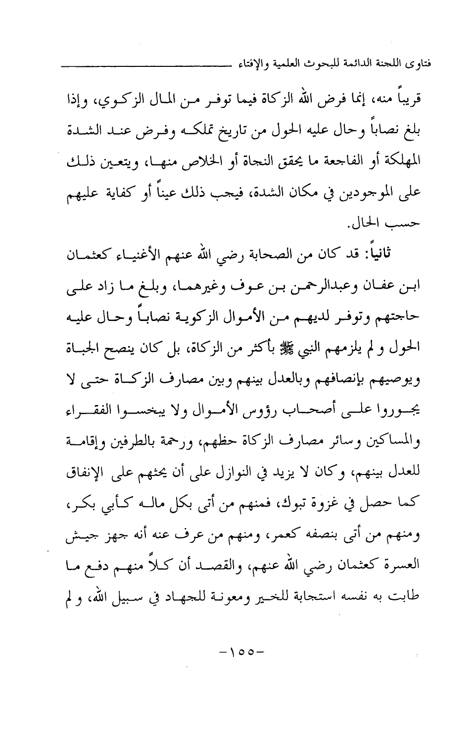 ثانيا: قد كان من الصحابة رضي الله عنهم الأغنياء كعثمان بن عفان وعبد الرحمن بن عوف وغيرهما، وبلغ ما زاد على حاجتهم وتوفر لديهم من الأموال الزكوية نصابا وحال عليه الحول ولم يلزمهم النبي صلى الله عليه وسلم بأكثر من الزكاة، بل كان ينصح الجباة ويوصيهم بإنصافهم وبالعدل بينهم وبين مصارف الزكاة حتى لا يجوروا على أصحاب رءوس الأموال ولا يبخسوا الفقراء والمساكين وسائر مصارف الزكاة حظهم، ورحمة بالطرفين وإقامة للعدل بينهم، وكان لا يزيد في النوازل على أن يحثهم على الإنفاق كما حصل في غزوة تبوك، فمنهم من أتى بكل ماله كأبي بكر، ومنهم من أتى بنصفه كعمر، ومنهم من عرف عنه أنه جهز جيش العسرة كعثمان رضي الله عنهم، والقصد أن كلا منهم دفع ما طابت به نفسه استجابة للخير ومعونة للجهاد في سبيل الله، ولم