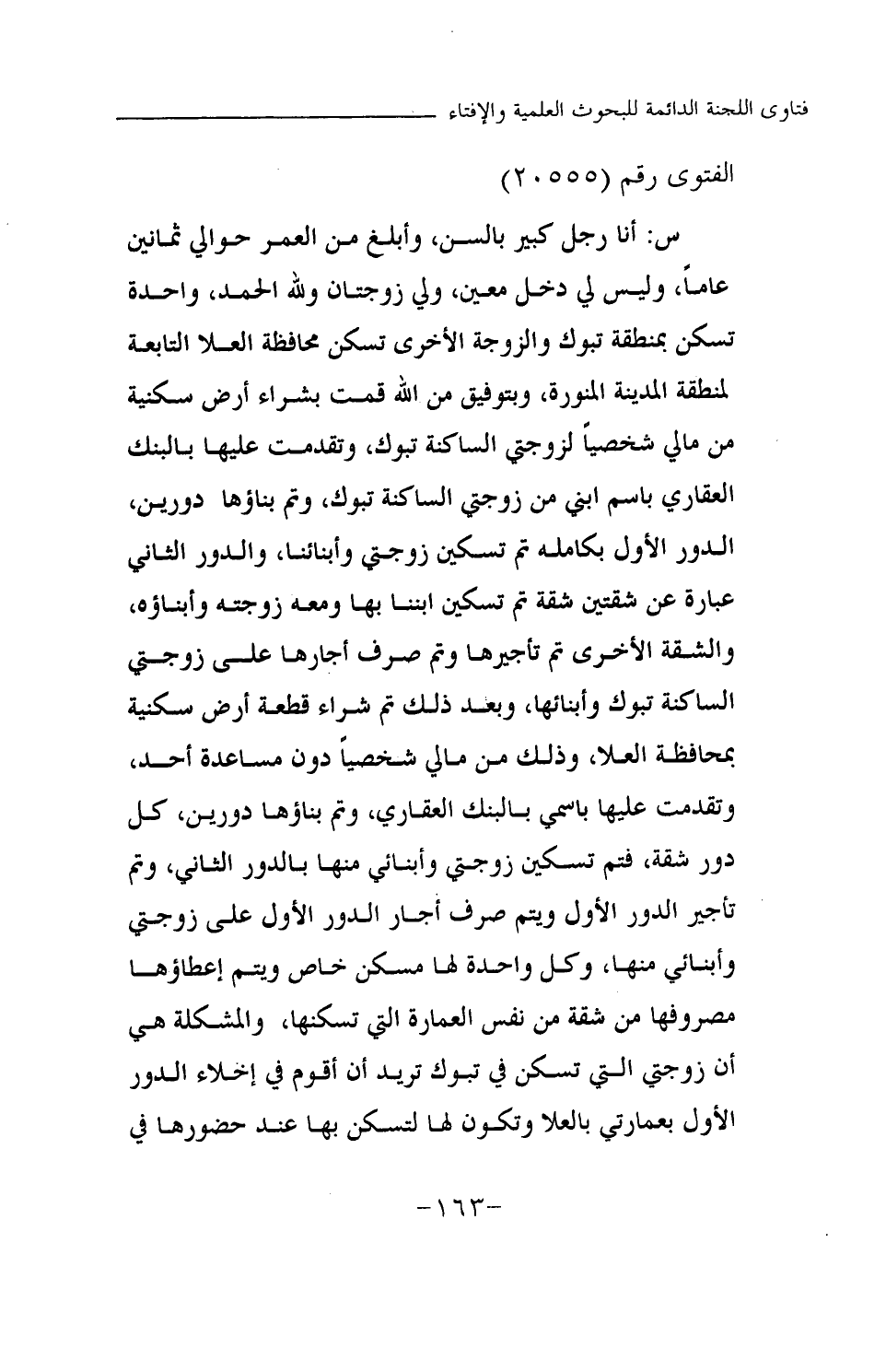 س: أنا رجل كبير بالسن، وأبلغ من العمر حوالي ثمانين عاما، وليس لي دخل معين، ولي زوجتان ولله الحمد، واحدة تسكن بمنطقة تبوك والزوجة الأخرى تسكن محافظة العلا التابعة لمنطقة المدينة المنورة، وبتوفيق من الله قمت بشراء أرض سكنية من مالي شخصيا لزوجتي الساكنة تبوك، وتقدمت عليها بالبنك العقاري باسم ابني من زوجتي الساكنة تبوك، وتم بناؤها دورين، الدور الأول بكامله تم تسكين زوجتي وأبنائنا، والدور الثاني عبارة عن شقتين شقة تم تسكين ابننا بها ومعه زوجته وأبناؤه، والشقة الأخرى تم تأجيرها وتم صرف إيجارها على زوجتي الساكنة تبوك وأبنائها، وبعد ذلك تم شراء قطعة أرض سكنية بمحافظة العلا، وذلك من مالي شخصيا دون مساعدة أحد، وتقدمت عليها بالبنك العقاري، وتم بناؤها دورين، كل دور شقة، فتم تسكين زوجتي وأبنائي منها بالدور الثاني، وتم تأجير الدور الأول ويتم صرف إيجار الدور الأول على زوجتي وأبنائي منها، وكل واحدة لها مسكن خاص ويتم إعطاؤها مصروفها من شقة من نفس العمارة التي تسكنها، والمشكلة هي أن زوجتي التي تسكن في تبوك تريد أن أقوم في إخلاء الدور الأول بعمارتي بالعلا وتكون لها لتسكن بها عند حضورها في