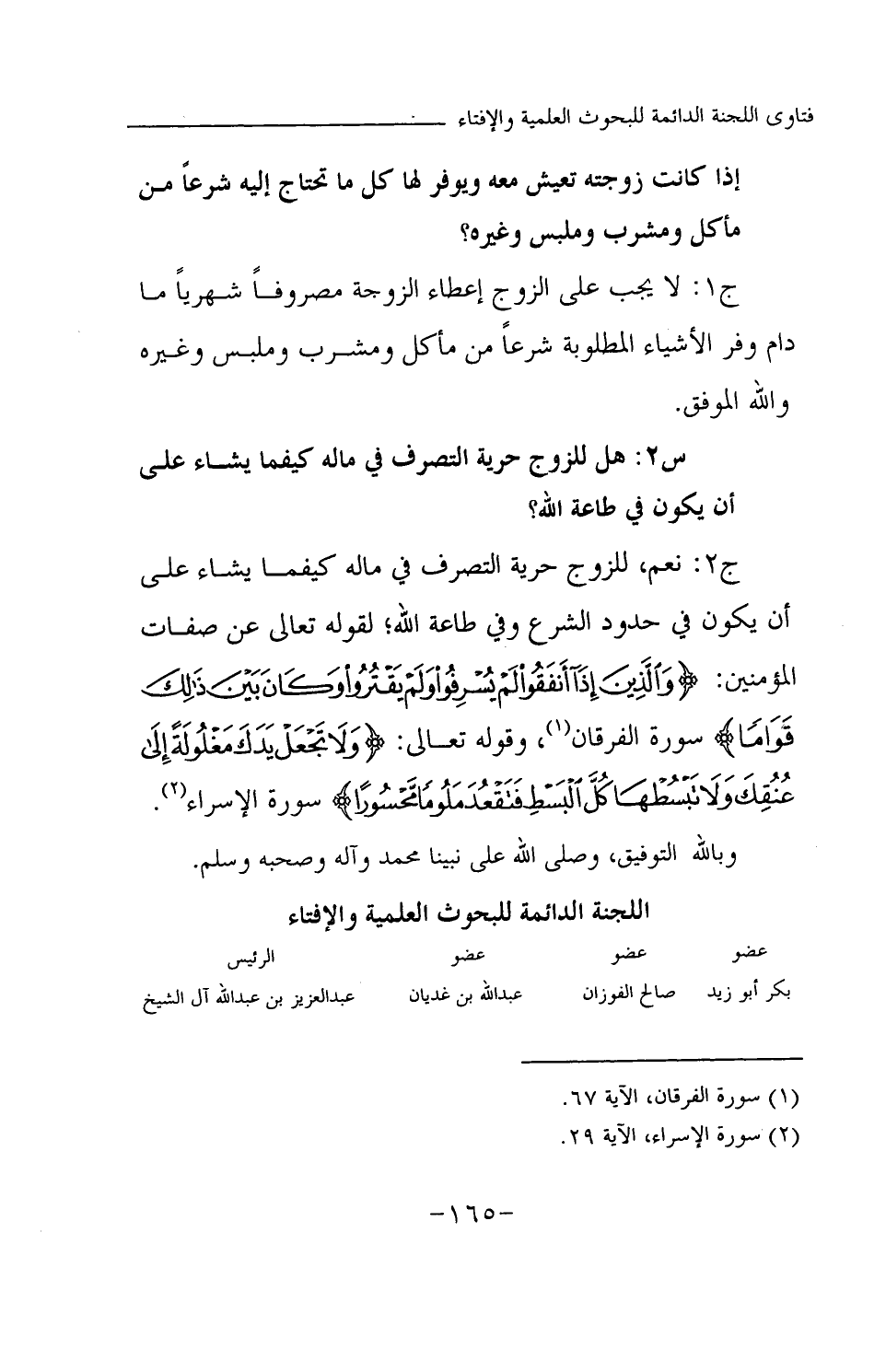 ج2: نعم، للزوج حرية التصرف في ماله كيفما يشاء على أن يكون في حدود الشرع وفى طاعة الله؛ لقوله تعالى عن صفات المؤمنين: {وَالَّذِينَ إِذَا أَنْفَقُوا لَمْ يُسْرِفُوا وَلَمْ يَقْتُرُوا وَكَانَ بَيْنَ ذَلِكَ قَوَامًا} (¬1) وقوله تعالى: {وَلَا تَجْعَلْ يَدَكَ مَغْلُولَةً إِلَى عُنُقِكَ وَلَا تَبْسُطْهَا كُلَّ الْبَسْطِ فَتَقْعُدَ مَلُومًا مَحْسُورًا} (¬2)