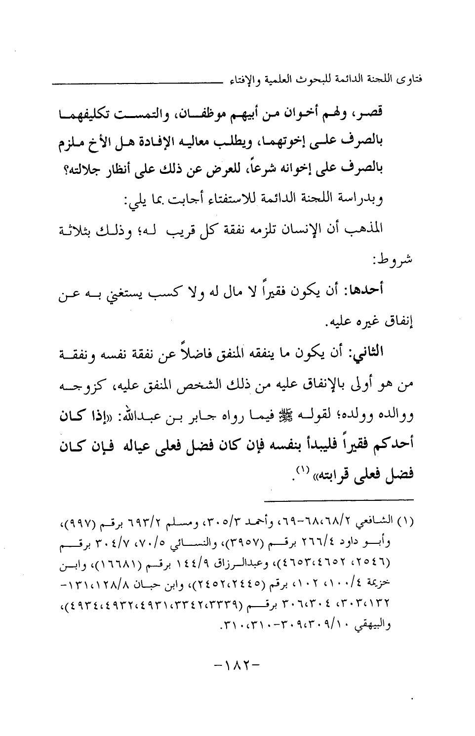الثاني: أن يكون ما ينفقه المنفق فاضلا عن نفقة نفسه ونفقة من هو أولى بالإنفاق عليه من ذلك الشخص المنفق عليه، كزوجه ووالده وولده؛ لقوله صلى الله عليه وسلم فيما رواه جابر بن عبد الله: «إذا كان أحدكم فقيرا فليبدأ بنفسه فإن كان فضل فعلى عياله فإن كان فضل فعلى قرابته (¬1) »