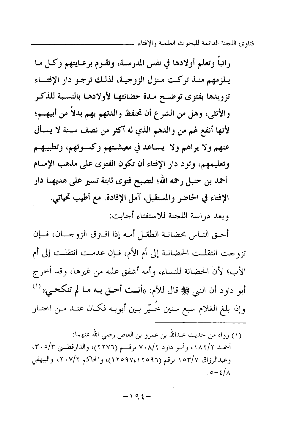 وبعد دراسة اللجنة للاستفتاء أجابت: أحق الناس بحضانة الطفل أمه إذا افترق الزوجان، فإن تزوجت انتقلت الحضانة إلى أم الأم، فإن عدمت انتقلت إلى أم الأب؛ لأن الحضانة للنساء، وأمه أشفق عليه من غيرها، وقد أخرج أبو داود أن النبي صلى الله عليه وسلم قال للأم: «أنت أحق به ما لم تنكحي (¬1) » وإذا بلغ الغلام سبع سنين خير بين أبويه فكان عند من اختار