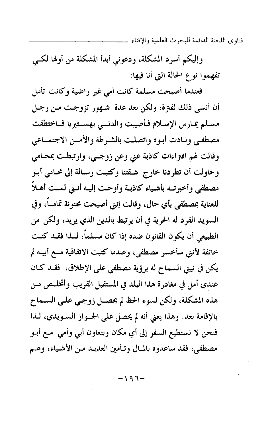 وإليكم أسرد المشكلة، ودعوني أبدأ المشكلة من أولها لكي تفهموا نوع الحالة التي أنا فيها: فعندما أصبحت مسلمة كانت أمي غير راضية وكانت تأمل أن أنسى ذلك لفترة، ولكن بعد عدة شهور تزوجت من رجل مسلم يمارس الإسلام فأصيبت والدتي بهستيريا فاختطفت مصطفى ونادت أبوه واتصلت بالشرطة والأمن الاجتماعي وقالت لهم افتراءات كاذبة عني وعن زوجي، وارتبطت بمحامي وحاولت أن تطردنا خارج شقتنا وكتبت رسالة إلى محامي أبو مصطفى وأخبرته بأشياء كاذبة وأوحت إليه أنني لست أهلا للعناية بمصطفى بأي حال، وقالت إنني أصبحت مجنونة تماما، وفي السويد الفرد له الحرية في أن يرتبط بالدين الذي يريد، ولكن من الطبيعي أن يكون القانون ضده إذا كان مسلما، لذا فقد كنت خائفة لأنني سأخسر مصطفى، وعندما كتبت الاتفاقية مع أبيه لم يكن في نيتي السماح له برؤية مصطفى على الإطلاق، فقد كان عندي أمل في مغادرة هذا البلد في المستقبل القريب وأتخلص من هذه المشكلة، ولكن لسوء الحظ لم يحصل زوجي على السماح بالإقامة بعد. وهذا يعني أنه لم يحصل على الجواز السويدي، لذا فنحن لا نستطيع السفر إلى أي مكان وبتعاون أبي وأمي مع أبو مصطفى، فقد ساعدوه بالمال وتأمين العديد من الأشياء، وهم