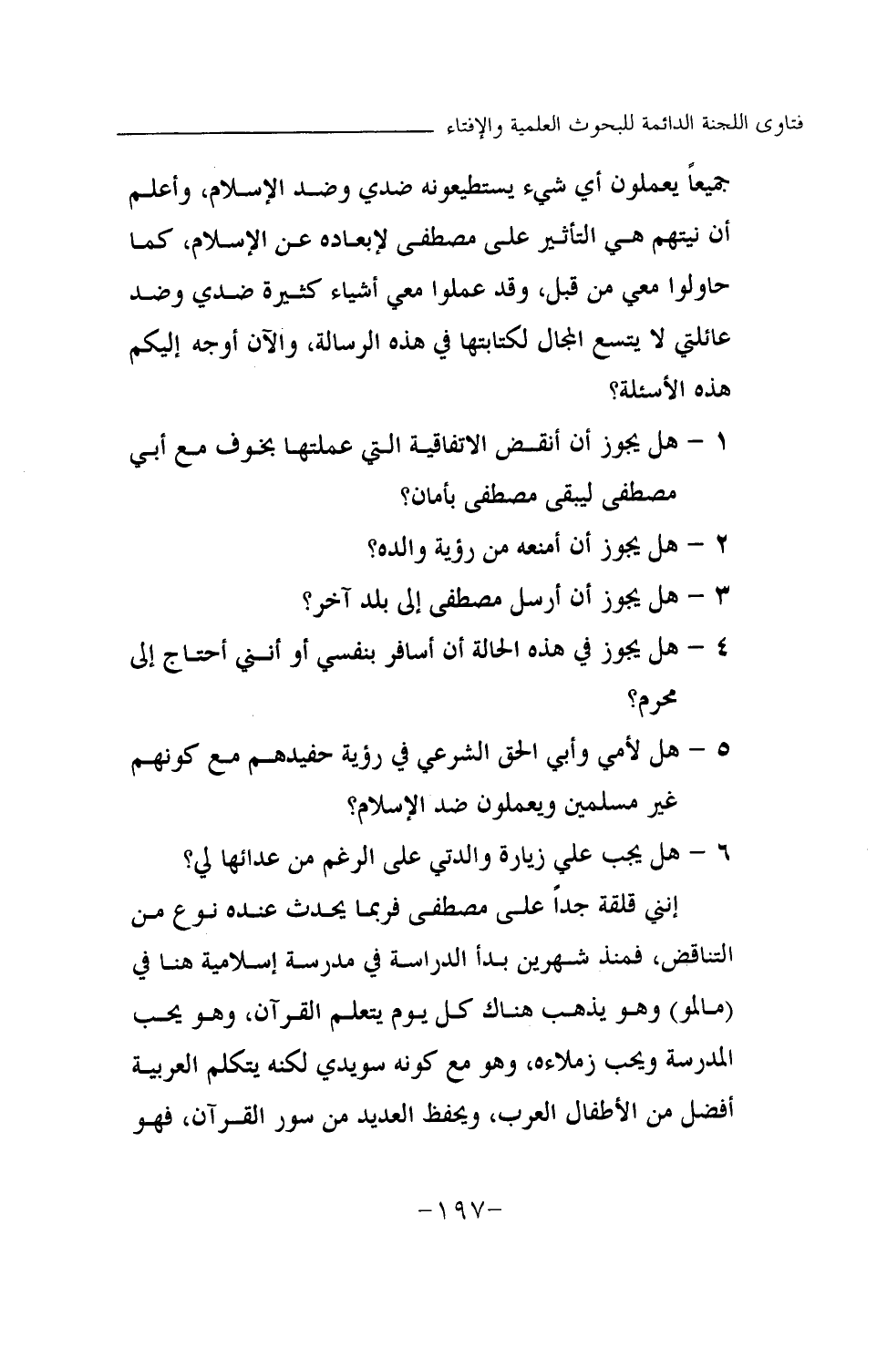 جميعا يعملون أي شيء يستطيعونه ضدي وضد الإسلام، وأعلم أن نيتهم هي التأثير على مصطفى لإبعاده عن الإسلام، كما حاولوا معي من قبل، وقد عملوا معي أشياء كثيرة ضدي وضد عائلتي لا يتسع المجال لكتابتها في هذه الرسالة، والآن أوجه إليكم هذه الأسئلة؟