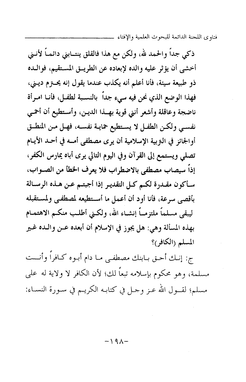 ج: إنك أحق بابنك مصطفى ما دام أبوه كافرا وأنت مسلمة، وهو محكوم بإسلامه تبعا لك؛ لأن الكافر لا ولاية له على مسلم؛ لقول الله عز وجل في كتابه الكريم في سورة النساء: