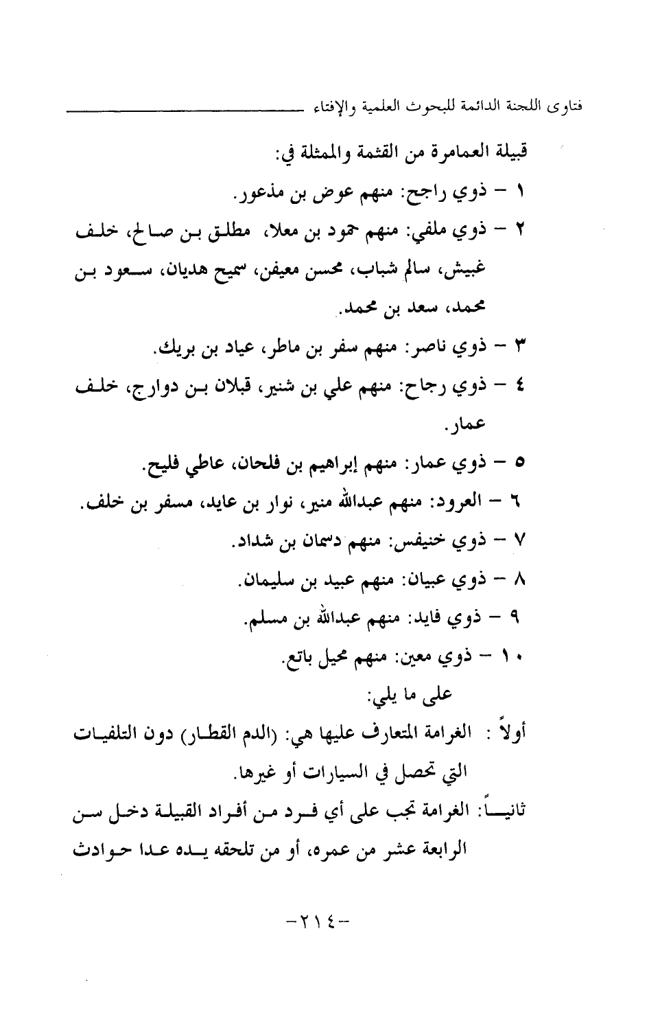 ثانيا: الغرامة تجب على أي فرد من أفراد القبيلة دخل سن الرابعة عشر من عمره، أو من تلحقه يده عدا حوادث
