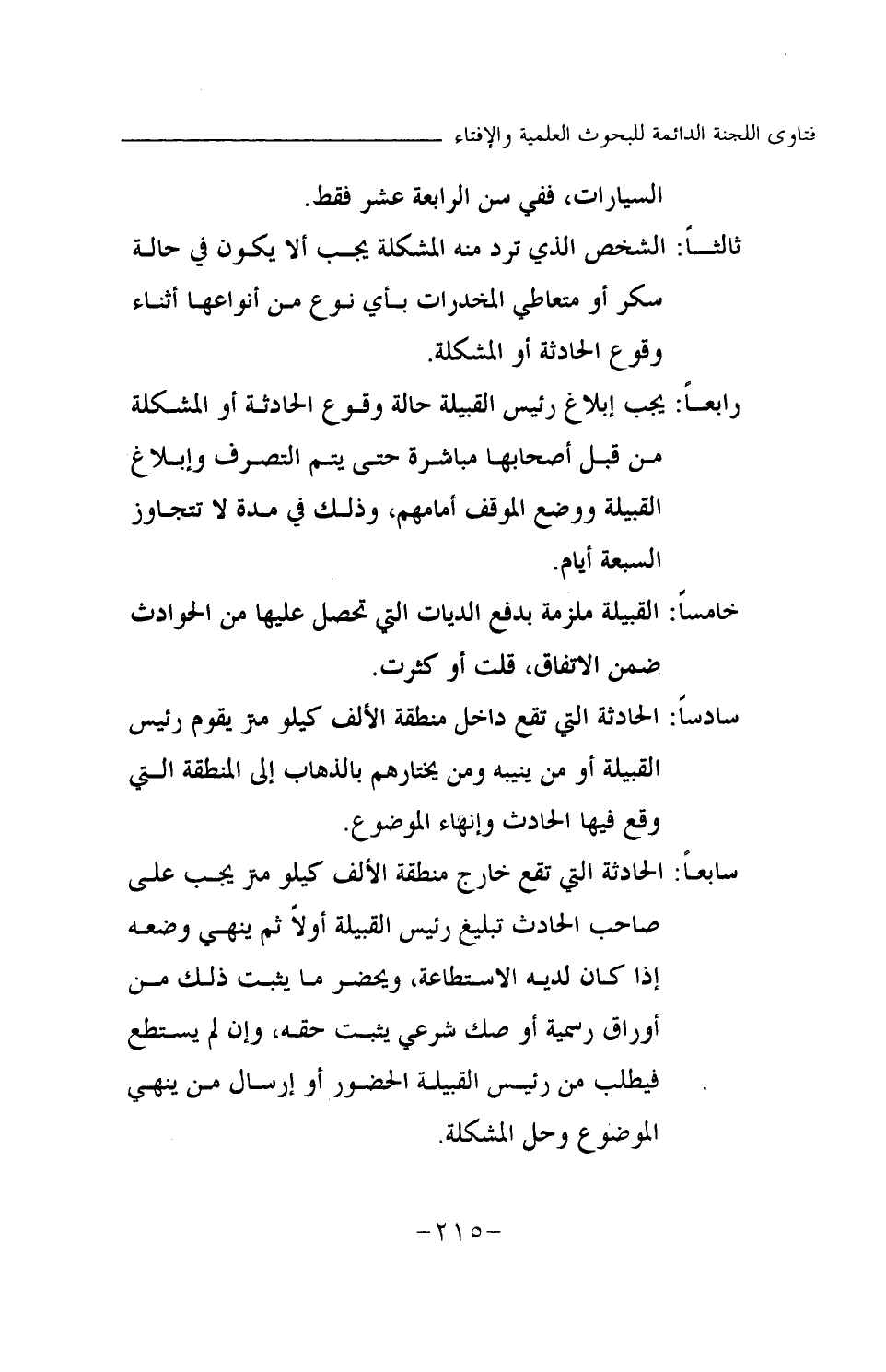 رابعا: يجب إبلاغ رئيس القبيلة حالة وقوع الحادثة أو المشكلة من قبل أصحابها مباشرة حتى يتم التصرف وإبلاغ القبيلة ووضع الموقف أمامهم، وذلك في مدة لا تتجاوز السبعة أيام.