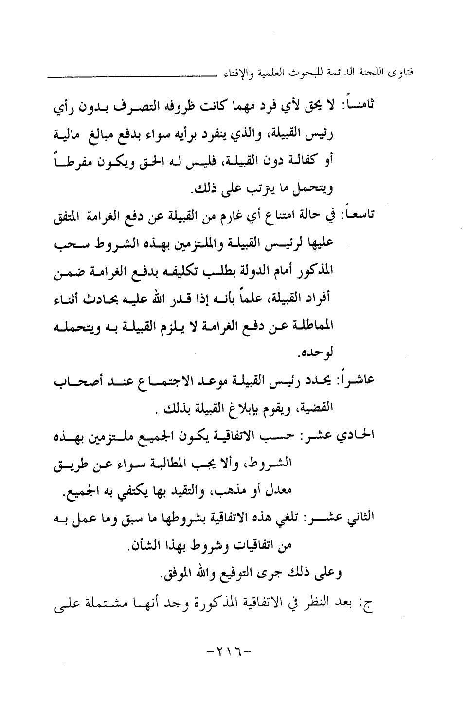 ثامنا: لا يحق لأي فرد مهما كانت ظروفه التصرف بدون رأي رئيس القبيلة، والذي ينفرد برأيه سواء بدفع مبالغ مالية أو كفالة دون القبيلة، فليس له الحق ويكون مفرطا ويتحمل ما يترتب على ذلك.