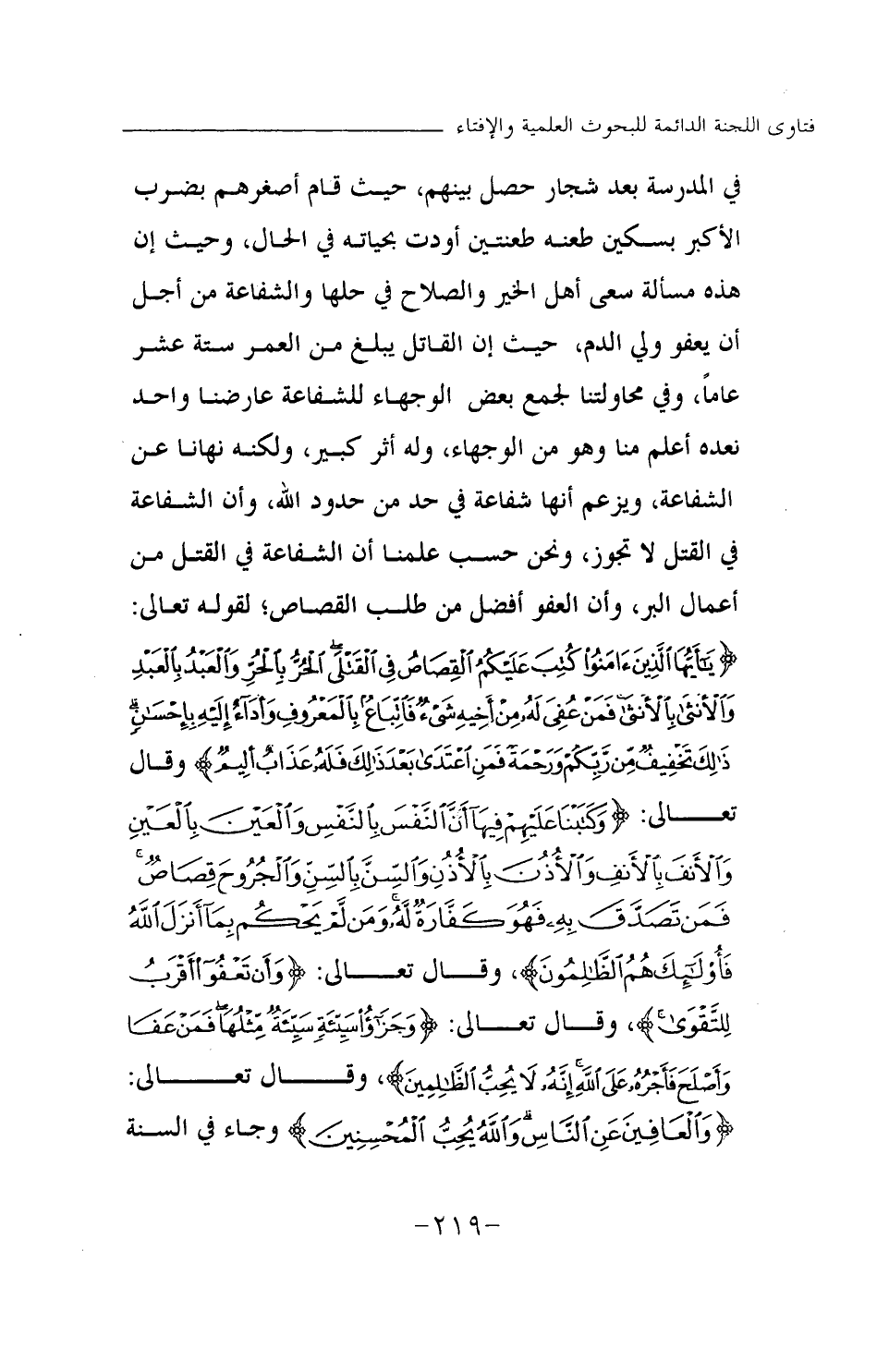 في المدرسة بعد شجار حصل بينهم، حيث قام أصغرهم بضرب الأكبر بسكين طعنه طعنتين أودت بحياته في الحال، وحيث إن هذه مسألة سعى أهل الخير والصلاح في حلها والشفاعة من أجل أن يعفو ولي الدم، حيث إن القاتل يبلغ من العمر ستة عشر عاما، وفي محاولتنا لجمع بعض الوجهاء للشفاعة عارضنا واحد نعده أعلم منا وهو من الوجهاء، وله أثر كبير، ولكنه نهانا عن الشفاعة، ويزعم أنها شفاعة في حد من حدود الله، وأن الشفاعة في القتل لا تجوز، ونحن حسب علمنا أن الشفاعة في القتل من أعمال البر، وأن العفو أفضل من طلب القصاص؛ لقوله تعالى: {يَا أَيُّهَا الَّذِينَ آمَنُوا كُتِبَ عَلَيْكُمُ الْقِصَاصُ فِي الْقَتْلَى الْحُرُّ بِالْحُرِّ وَالْعَبْدُ بِالْعَبْدِ وَالأُنْثَى بِالأُنْثَى فَمَنْ عُفِيَ لَهُ مِنْ أَخِيهِ شَيْءٌ فَاتِّبَاعٌ بِالْمَعْرُوفِ وَأَدَاءٌ إِلَيْهِ بِإِحْسَانٍ ذَلِكَ تَخْفِيفٌ مِنْ رَبِّكُمْ وَرَحْمَةٌ فَمَنِ اعْتَدَى بَعْدَ ذَلِكَ فَلَهُ عَذَابٌ أَلِيمٌ} (¬1) وقال تعالى: {وَكَتَبْنَا عَلَيْهِمْ فِيهَا أَنَّ النَّفْسَ بِالنَّفْسِ وَالْعَيْنَ بِالْعَيْنِ وَالْأَنْفَ بِالْأَنْفِ وَالْأُذُنَ بِالْأُذُنِ وَالسِّنَّ بِالسِّنِّ وَالْجُرُوحَ قِصَاصٌ فَمَنْ تَصَدَّقَ بِهِ فَهُوَ كَفَّارَةٌ لَهُ وَمَنْ لَمْ يَحْكُمْ بِمَا أَنْزَلَ اللَّهُ فَأُولَئِكَ هُمُ الظَّالِمُونَ} (¬2) وقال تعالى: {وَأَنْ تَعْفُوا أَقْرَبُ لِلتَّقْوَى} (¬3) وقال تعالى: {وَجَزَاءُ سَيِّئَةٍ سَيِّئَةٌ مِثْلُهَا فَمَنْ عَفَا وَأَصْلَحَ فَأَجْرُهُ عَلَى اللَّهِ إِنَّهُ لَا يُحِبُّ الظَّالِمِينَ} (¬4) وقال تعالى: {وَالْعَافِينَ عَنِ النَّاسِ وَاللَّهُ يُحِبُّ الْمُحْسِنِينَ} (¬5) وجاء في السنة