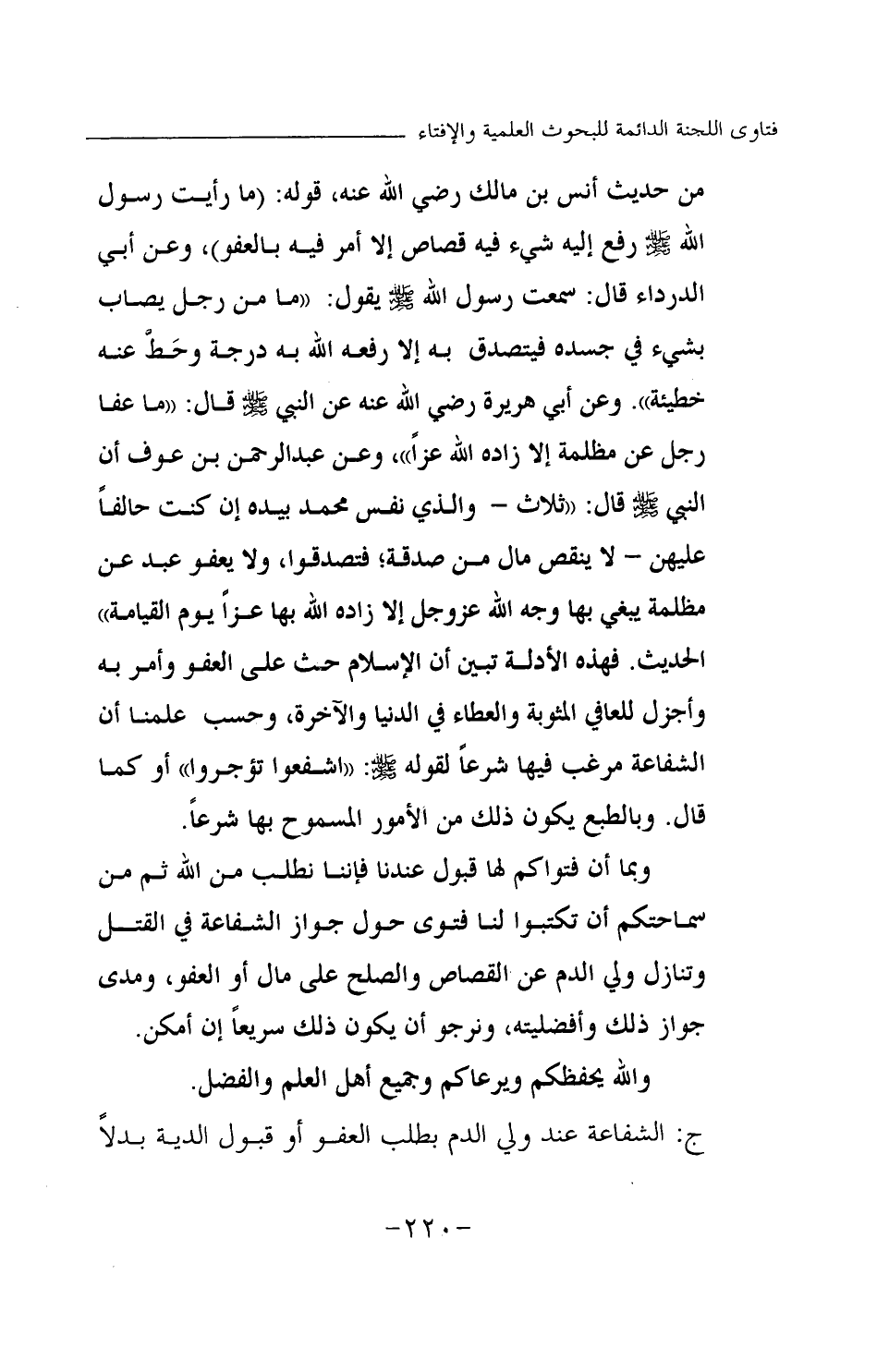 من حديث أنس بن مالك رضي الله عنه، قوله: «ما رأيت رسول الله صلى الله عليه وسلم رفع إليه شيء فيه قصاص إلا أمر فيه بالعفو (¬1) » ، وعن أبي الدرداء قال: سمعت رسول الله صلى الله عليه وسلم يقول: «ما من رجل يصاب بشيء في جسده فيتصدق به إلا رفعه الله به درجة وحط عنه خطيئة (¬2) » . وعن أبي هريرة رضي الله عنه عن النبي صلى الله عليه وسلم قال: «ما عفا رجل عن مظلمة إلا زاده الله عزا (¬3) » ، وعن عبد الرحمن بن عوف أن النبي صلى الله عليه وسلم قال: «ثلاث- والذي نفس محمد بيده إن كنت حالفا عليهن- لا ينقص مال من صدقة؛ فتصدقوا، ولا يعفو عبد عن مظلمة يبغي بها وجه الله عز وجل إلا زاده الله بها عزا يوم القيامة (¬4) » الحديث. فهذه الأدلة تبين أن الإسلام حث على العفو وأمر به وأجزل للعافي المثوبة والعطاء في الدنيا والآخرة، وحسب علمنا أن الشفاعة مرغب فيها شرعا لقوله صلى الله عليه وسلم: «اشفعوا تؤجروا (¬5) » أو كما قال. وبالطبع يكون ذلك من الأمور المسموح بها شرعا.