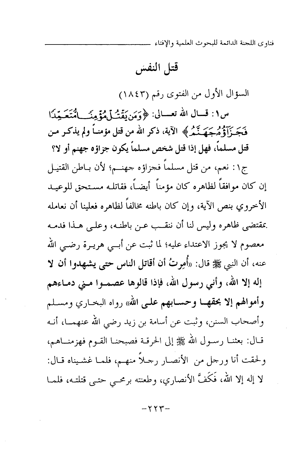 ج 1: نعم، من قتل مسلما فجزاؤه جهنم؛ لأن باطن القتيل إن كان موافقا لظاهره كان مؤمنا أيضا، فقاتله مستحق للوعيد الأخروي بنص الآية، وإن كان باطنه مخالفا لظاهره فعلينا أن نعامله بمقتضى ظاهره وليس لنا أن ننقب عن باطنه، وعلى هذا فدمه معصوم لا يجوز الاعتداء عليه؛ لما ثبت عن أبي هريرة رضي الله عنه، أن النبي صلى الله عليه وسلم قال: «أمرت أن أقاتل الناس حتى يشهدوا أن لا إله إلا الله، وأني رسول الله، فإذا قالوها عصموا مني دماءهم وأموالهم إلا بحقها وحسابهم على الله (¬2) » رواه البخاري ومسلم وأصحاب السنن، وثبت عن أسامة بن زيد رضي الله عنهما، أنه قال: «بعثنا رسول الله صلى الله عليه وسلم إلى الحرقة فصبحنا القوم فهزمناهم، ولحقت أنا ورجل من الأنصار رجلا منهم، فلما غشيناه قال: لا إله إلا الله، فكف الأنصاري، وطعنته برمحي حتى قتلته، فلما