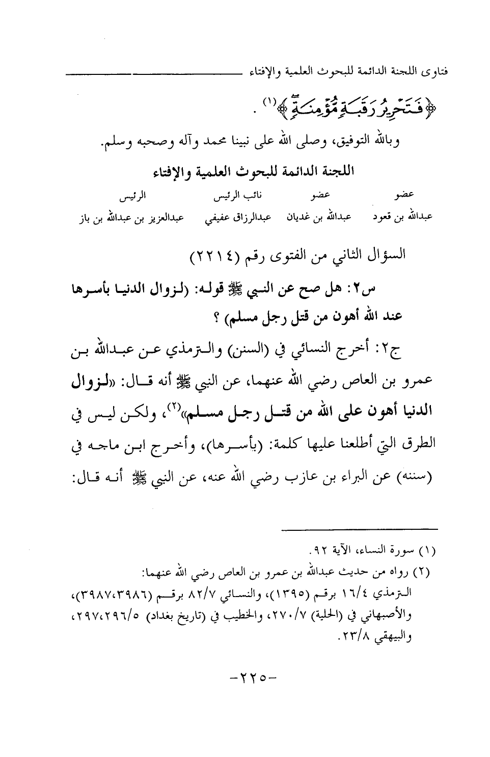 ج2: أخرج النسائي في (السنن) والترمذي عن عبد الله بن عمرو بن العاص رضي الله عنهما، عن النبي صلى الله عليه وسلم أنه قال: «لزوال الدنيا أهون على الله من قتل رجل مسلم (¬1) » ولكن ليس في الطرق التي اطلعنا عليها كلمة: (بأسرها) ، وأخرج ابن ماجه في (سننه) عن البراء بن عازب رضي الله عنه، عن النبي صلى الله عليه وسلم أنه قال: «لزوال الدنيا أهون على الله من قتل مؤمن بغير حق (¬2) »