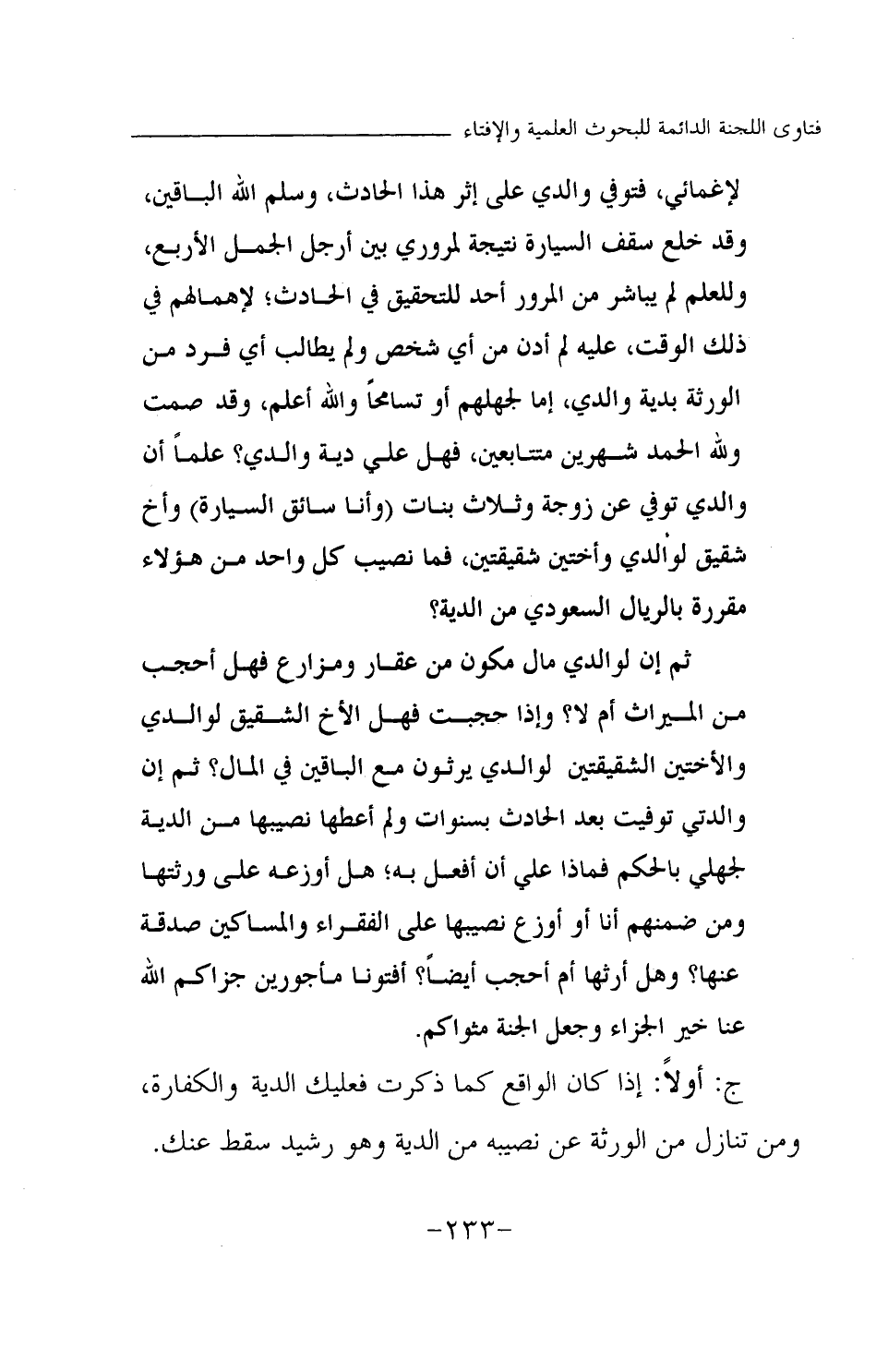 لإغمائي، فتوفي والدي على إثر هذا الحادث، وسلم الله الباقين، وقد خلع سقف السيارة نتيجة لمروري بين أرجل الجمل الأربع، وللعلم لم يباشر من المرور أحد للتحقيق في الحادث؛ لإهمالهم في ذلك الوقت، عليه لم أدن من أي شخص ولم يطالب أي فرد من الورثة بدية والدي، إما لجهلهم أو تسامحا والله أعلم، وقد صمت ولله الحمد شهرين متتابعين، فهل علي دية والدي؟ علما أن والدي توفي عن زوجة وثلاث بنات (وأنا سائق السيارة) وأخ شقيق لوالدي وأختين شقيقتين، فما نصيب كل واحد من هؤلاء مقررة بالريال السعودي من الدية؟