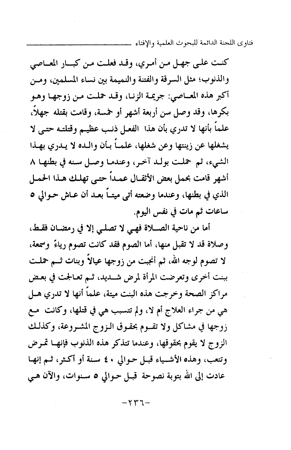 أما من ناحية الصلاة فهي لا تصلي إلا في رمضان فقط، وصلاة قد لا تقبل منها، أما الصوم فقد كانت تصوم رياء وسمعة، لا تصوم لوجه الله، ثم أنجبت من زوجها عيالا وبنات ثم حملت ببنت أخرى وتعرضت المرأة لمرض شديد، ثم تعالجت في بعض مراكز الصحة وخرجت هذه البنت ميتة، علما أنها لا تدري هل هي من جراء العلاج أم لا، ولم تتسبب هي في قتلها، وكانت مع زوجها في مشاكل ولا تقوم بحقوق الزوج المشروعة، وكذلك الزوج لا يقوم بحقوقها، وعندما تتذكر هذه الذنوب فإنها تمرض وتتعب، وهذه الأشياء قبل حوالي 45 سنة أو أكثر، ثم إنها عادت إلى الله بتوبة نصوحة قبل حوالي 5 سنوات، والآن هي