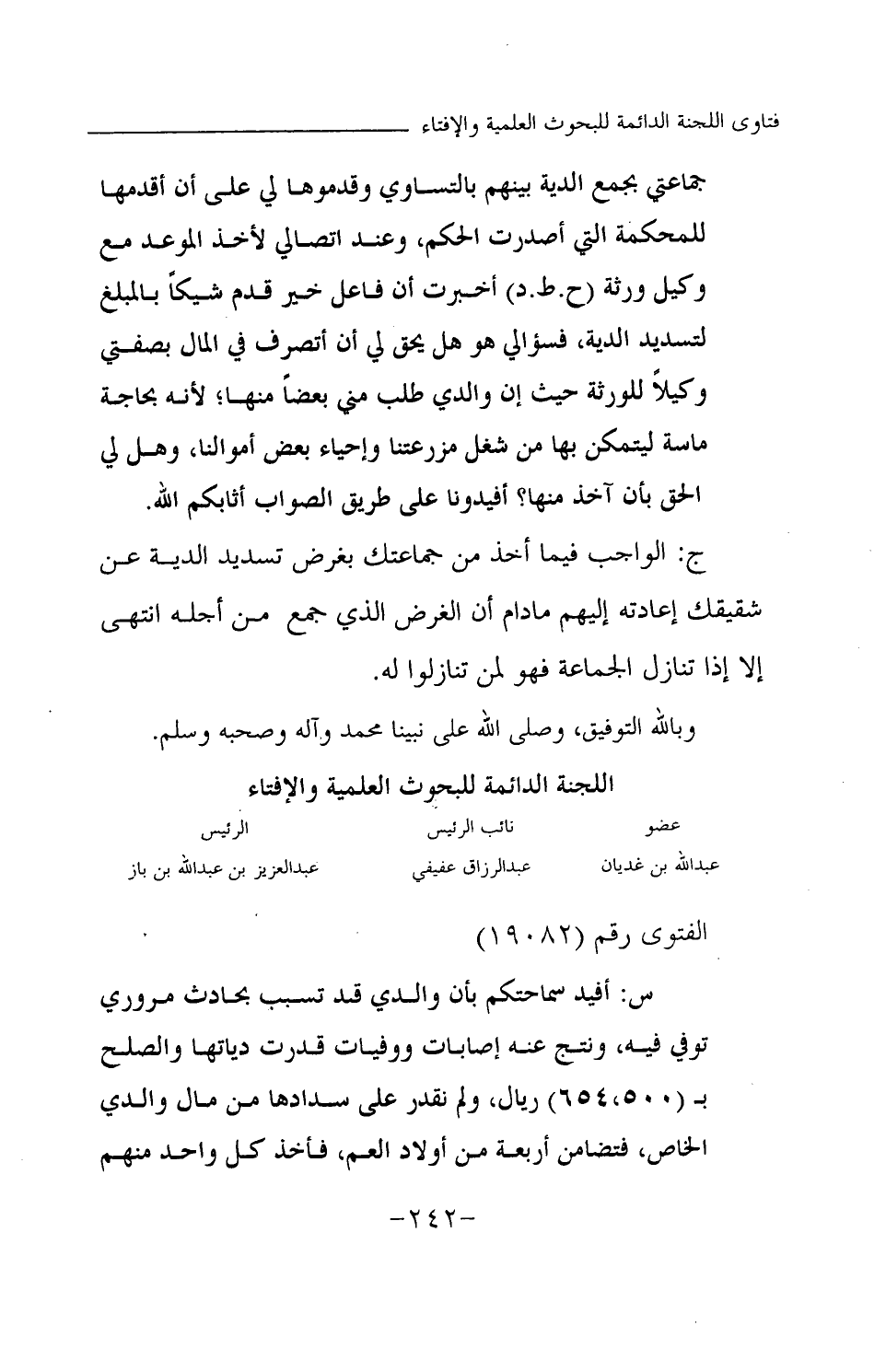 س: أفيد سماحتكم بأن والدي قد تسبب بحادث مروري توفي فيه، ونتج عنه إصابات ووفيات قدرت دياتها والصلح ب (505، 654) ريال، ولم نقدر على سدادها من مال والدي الخاص، فتضامن أربعة من أولاد العم، فأخذ كل واحد منهم