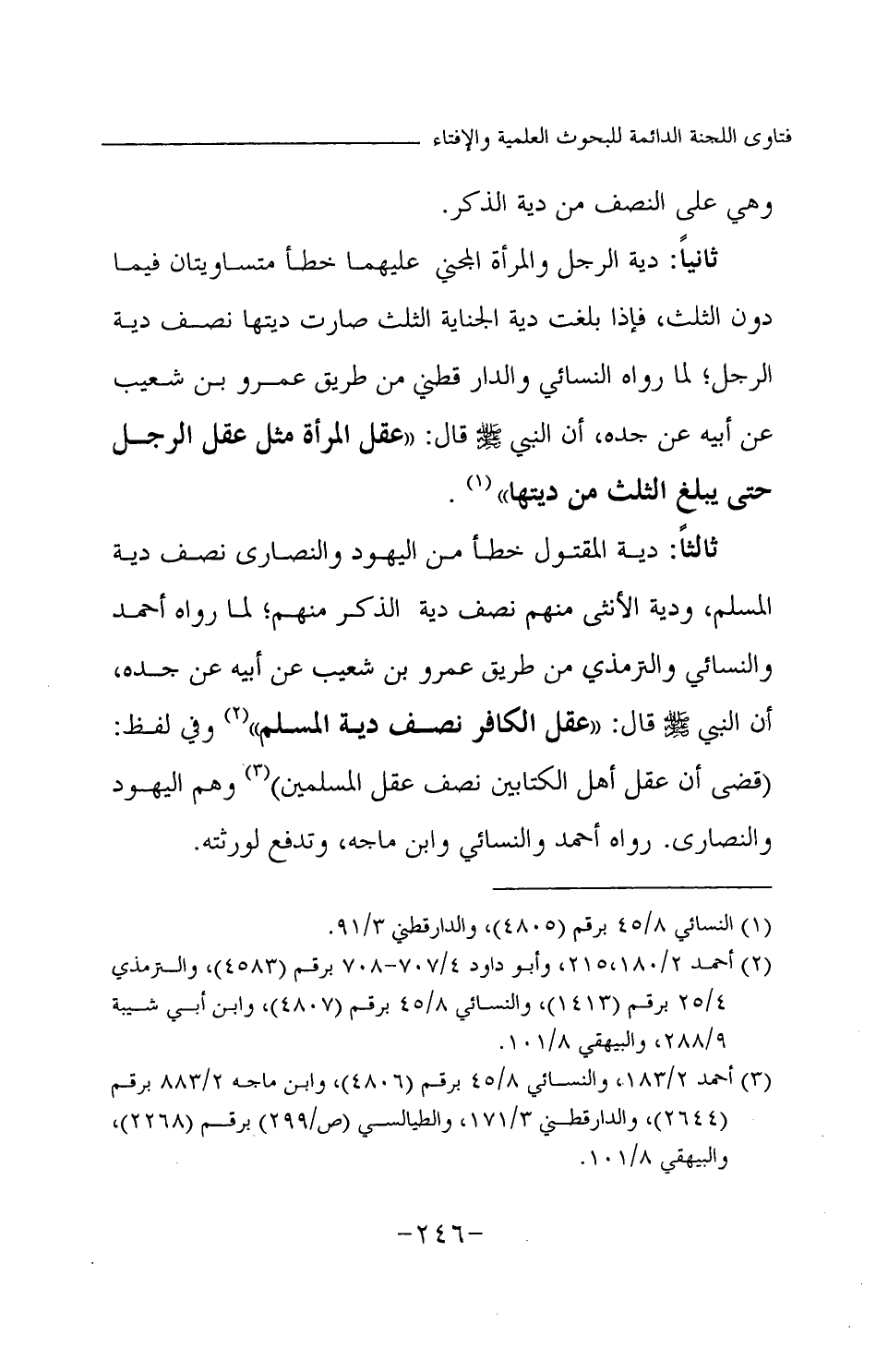 (¬2) أحمد 2 / 180، 215، وأبو داود 7 / 704 -708 برقم (4583) ، والترمذي 4 / 25 برقم (1413) ، والنسائي 8 / 45 برقم (4807) ، وابن أبي شيبة 9 / 288، والبيهقي 8 / 101. وفي لفظ: (قضى أن عقل أهل الكتابين نصف عقل المسلمين) أحمد 2 / 183، والنسائي 8 / 45 برقم (4806) ، وابن ماجه 2 / 883 برقم (2644) ، والدارقطني 3 / 171، والطيالسي (ص / 299) برقم (2268) ، والبيهقي 8 / 101.