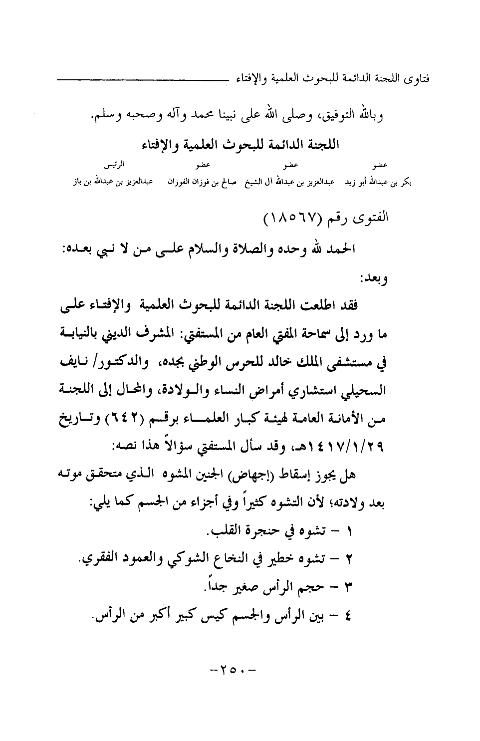 فقد اطلعت اللجنة الدائمة للبحوث العلمية والإفتاء على ما ورد إلى سماحة المفتي العام من المستفتي: المشرف الديني بالنيابة في مستشفى الملك خالد للحرس الوطني بجدة، والدكتور \ نايف السحيلي استشاري أمراض النساء والولادة، والمحال إلى اللجنة من الأمانة العامة لهيئة كبار العلماء برقم (642) وتاريخ 29 \ 1 \ 1417 هـ، وقد سأل المستفتي سؤالا هذا نصه: