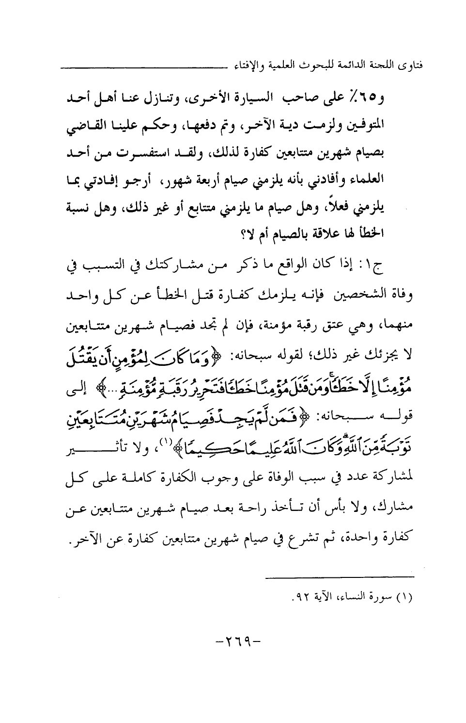 ج1: إذا كان الواقع ما ذكر من مشاركتك في التسبب في وفاة الشخصين فإنه يلزمك كفارة قتل الخطأ عن كل واحد منهما، وهي عتق رقبة مؤمنة، فإن لم تجد فصيام شهرين متتابعين لا يجزئك غير ذلك؛ لقوله سبحانه: {وَمَا كَانَ لِمُؤْمِنٍ أَنْ يَقْتُلَ مُؤْمِنًا إِلَّا خَطَأً وَمَنْ قَتَلَ مُؤْمِنًا خَطَأً فَتَحْرِيرُ رَقَبَةٍ مُؤْمِنَةٍ} (¬1) إلى قوله سبحانه: {فَمَنْ لَمْ يَجِدْ فَصِيَامُ شَهْرَيْنِ مُتَتَابِعَيْنِ تَوْبَةً مِنَ اللَّهِ وَكَانَ اللَّهُ عَلِيمًا حَكِيمًا} (¬2) ولا تأثير لمشاركة عدد في سبب الوفاة على وجوب الكفارة كاملة على كل مشارك، ولا بأس أن تأخذ راحة بعد صيام شهرين متتابعين عن كفارة واحدة، ثم تشرع في صيام شهرين متتابعين كفارة عن الآخر.