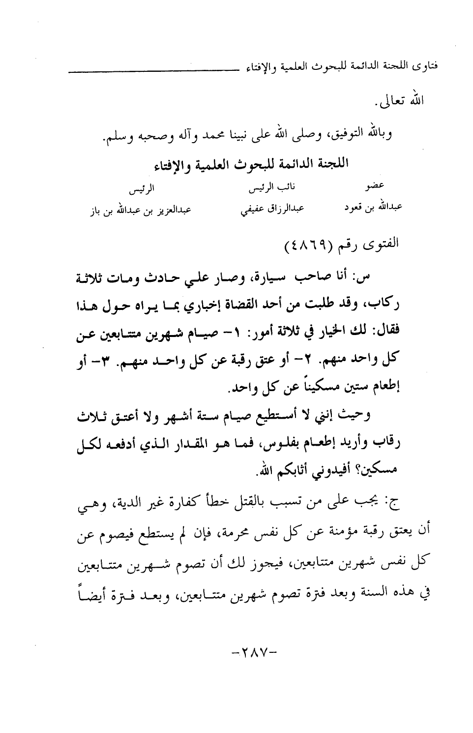 س: أنا صاحب سيارة، وصار علي حادث ومات ثلاثة ركاب، وقد طلبت من أحد القضاة إخباري بما يراه حول هذا فقال: لك الخيار في ثلاثة أمور: 1- صيام شهرين متتابعين عن كل واحد منهم. 2- أو عتق رقبة عن كل واحد منهم. 3- أو إطعام ستين مسكينا عن كل واحد.