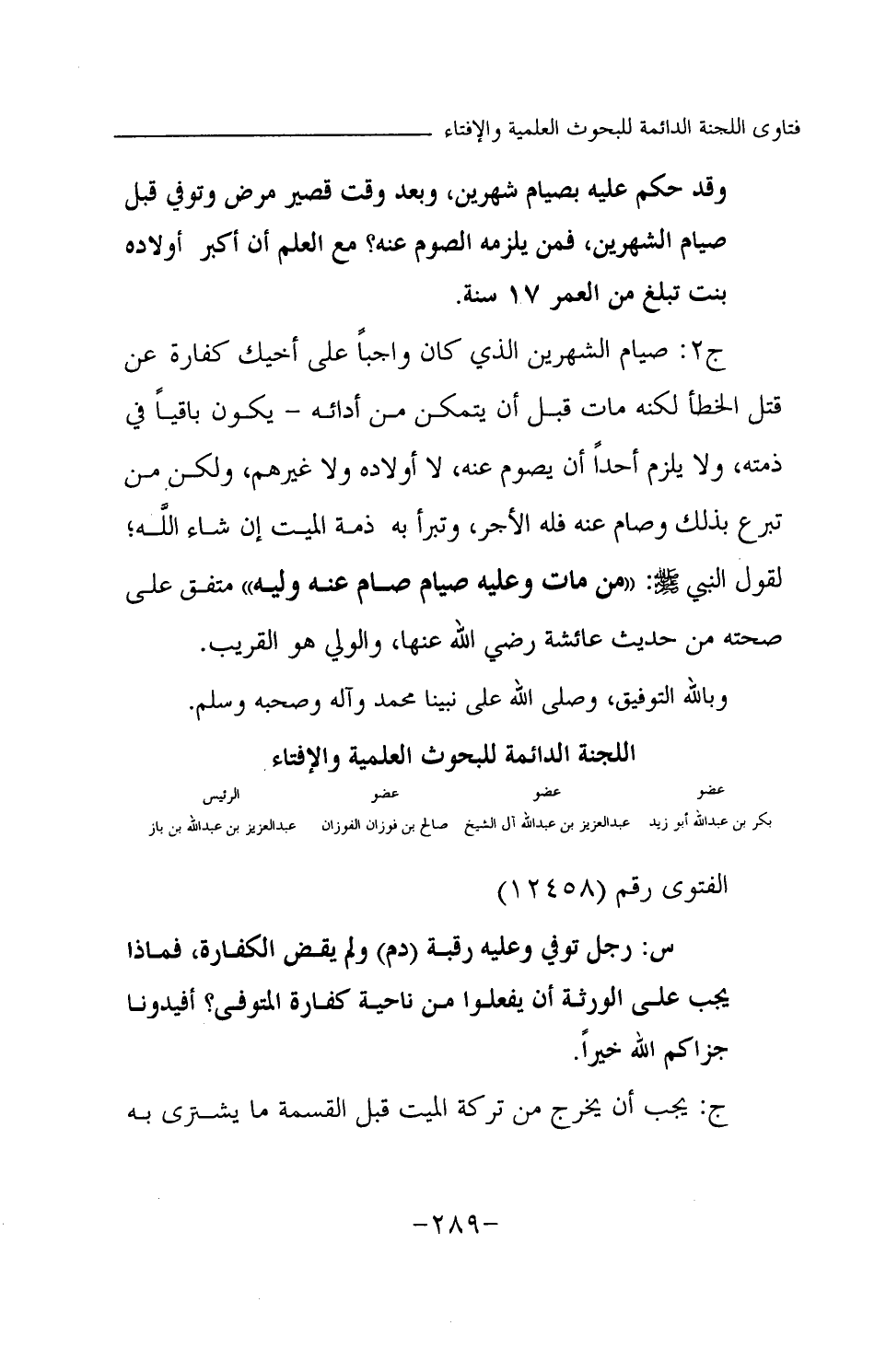 ج 2: صيام الشهرين الذي كان واجبا على أخيك كفارة عن قتل الخطأ لكنه مات قبل أن يتمكن من أدائه- يكون باقيا في ذمته، ولا يلزم أحدا أن يصوم عنه، لا أولاده ولا غيرهم، ولكن من تبرع بذلك وصام عنه فله الأجر، وتبرأ به ذمة الميت إن شاء الله؛ لقول النبي صلى الله عليه وسلم: «من مات وعليه صيام صام عنه وليه (¬1) » متفق على صحته من حديث عائشة رضي الله عنها، والولي هو القريب.