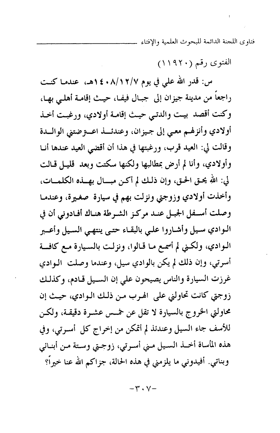 س: قدر الله علي في يوم 7 \ 12 \ 1408 هـ، عندما كنت راجعا من مدينة جيزان إلى جبال فيفا، حيث إقامة أهلي بها، وكنت أقصد بيت والدتي حيث إقامة أولادي، ورغبت أخذ أولادي وأنزلهم معي إلى جيزان، وعندئذ اعترضتني الوالدة وقالت لي: العيد قرب، ورغبتها في هذا أن أقضي العيد عندها أنا وأولادي، وأنا لم أرض بمطالبها ولكنها سكتت وبعد قليل قالت لي: الله يحق الحق، وإن ذلك لم أكن مبال بهذه الكلمات، وأخذت أولادي وزوجتي ونزلت بهم في سيارة صغيرة، وعندما وصلت أسفل الجبل عند مركز الشرطة هناك أفادوني أن في الوادي سيل وأشاروا علي بالبقاء حتى ينتهي السيل وأعبر الوادي، ولكني لم أسمع ما قالوا، ونزلت بالسيارة مع كافة أسرتي، وإن ذلك لم يكن بالوادي سيل، وعندما وصلت الوادي غرزت السيارة والناس يصيحون علي إن السيل قادم، وكذلك زوجتي كانت تحاولني على الهرب من ذلك الوادي، حيث إن محاولتي الخروج بالسيارة لا تقل عن خمس عشرة دقيقة، ولكن للأسف جاء السيل وعندئذ لم أتمكن من إخراج كل أسرتي، وفي هذه المأساة أخذ السيل مني أسرتي، زوجتي وستة من أبنائي وبناتي. أفيدوني ما يلزمني في هذه الحالة، جزاكم الله عنا خيرا؟
