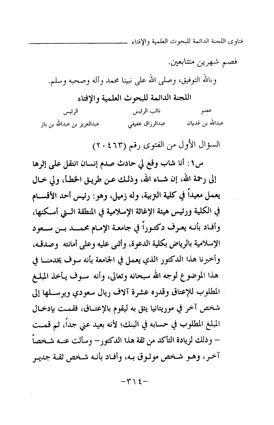 س1: أنا شاب وقع لي حادث صدم إنسان انتقل على إثرها إلى رحمة الله، إن شاء الله، وذلك عن طريق الخطأ، ولي خال يعمل معيدا في كلية التربية، وله زميل، وهو: رئيس أحد الأقسام في الكلية ورئيس هيئة الإغاثة الإسلامية في المنطقة التي أسكنها، وأفاد بأنه يعرف دكتورا في جامعة الإمام محمد بن سعود الإسلامية بالرياض بكلية الدعوة، وأثنى عليه وعلى أمانته وصدقه، وأخبرنا هذا الدكتور الذي يعمل في الجامعة بأنه سوف يخدمنا في هذا الموضوع لوجه الله سبحانه وتعالى، وأنه سوف يأخذ المبلغ المطلوب للإعتاق وقدره عشرة آلاف ريال سعودي ويرسلها إلى شخص آخر في موريتانيا يثق به ليقوم بالإعتاق، فقمت بإدخال المبلغ المطلوب في حسابه في البنك؛ لأنه بعيد عني جدا، ثم قمت - وذلك لزيادة التأكد من ثقة هذا الدكتور- وسألت عنه شخصا آخر، وهو شخص موثوق به، وأفاد بأنه شخص ثقة جدير