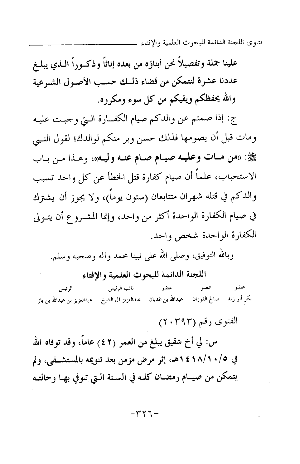 ج: إذا صمتم عن والدكم صيام الكفارة التي وجبت عليه ومات قبل أن يصومها فذلك حسن وبر منكم لوالدك؛ لقول النبي صلى الله عليه وسلم: «من مات وعليه صيام صام عنه وليه (¬1) » ، وهذا من باب الاستحباب، علما أن صيام كفارة قتل الخطأ عن كل واحد تسبب والدكم في قتله شهران متتابعان (ستون يوما) ، ولا يجوز أن يشترك في صيام الكفارة الواحدة أكثر من واحد، وإنما المشروع أن يتولى الكفارة الواحدة شخص واحد.