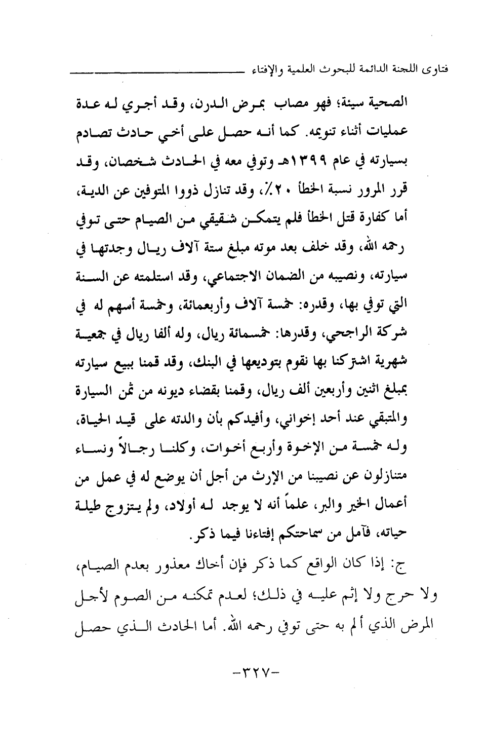 الصحية سيئة؛ فهو مصاب بمرض الدرن، وقد أجري له عدة عمليات أثناء تنويمه. كما أنه حصل على أخي حادث تصادم بسيارته في عام1399 هـ وتوفي معه في الحادث شخصان، وقد قرر المرور نسبة الخطأ 20%، وقد تنازل ذووا المتوفين عن الدية، أما كفارة قتل الخطأ فلم يتمكن شقيقي من الصيام حتى توفي رحمه الله، وقد خلف بعد موته مبلغ ستة آلاف ريال وجدتها في سيارته، ونصيبه من الضمان الاجتماعي، وقد استلمته عن السنة التي توفي بها، وقدره: خمسة آلاف وأربعمائة، وخمسة أسهم له في شركة الراجحي، وقدرها: خمسمائة ريال، وله ألفا ريال في جمعية شهرية اشتركنا بها نقوم بتوديعها في البنك، وقد قمنا ببيع سيارته بمبلغ اثنين وأربعين ألف ريال، وقمنا بقضاء ديونه من ثمن السيارة والمتبقي عند أحد إخواني، وأفيدكم بأن والدته على قيد الحياة، وله خمسة من الإخوة وأربع أخوات، وكلنا رجالا ونساء متنازلون عن نصيبنا من الإرث من أجل أن يوضع له في عمل من أعمال الخير والبر، على أنه لا يوجد له أولاد، ولم يتزوج طيلة حياته، فآمل من سماحتكم إفتاءنا فيما ذكر.