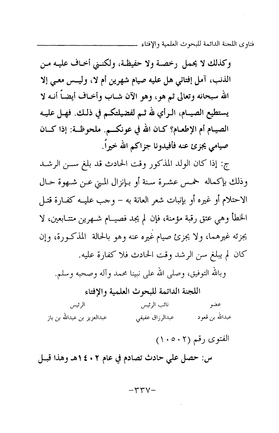 ج: إذا كان الولد المذكور وقت الحادث قد بلغ سن الرشد وذلك بإكماله خمس عشرة سنة أو بإنزال المني عن شهوة حال الاحتلام أو غيره أو بإنبات شعر العانة به- وجب عليه كفارة قتل الخطأ وهي عتق رقبة مؤمنة، فإن لم يجد فصيام شهرين متتابعين، لا يجزئه غيرهما، ولا يجزئ صيام غيره عنه وهو بالحالة المذكورة، وإن كان لم يبلغ سن الرشد وقت الحادث فلا كفارة عليه.