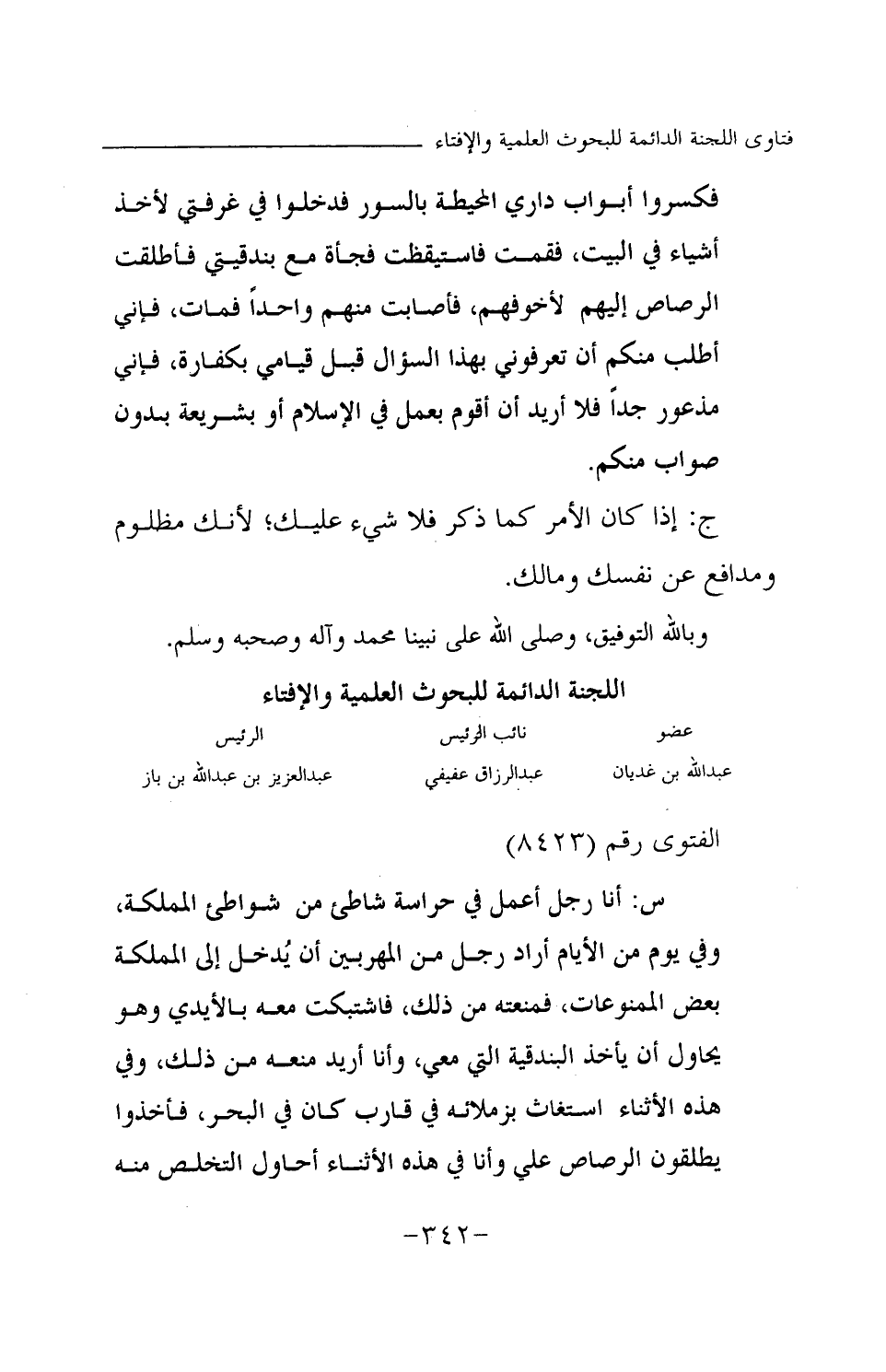 س: أنا رجل أعمل في حراسة شاطئ من شواطئ المملكة، وفي يوم من الأيام أراد رجل من المهربين أن يدخل إلى المملكة بعض الممنوعات، فمنعته من ذلك، فاشتبكت معه بالأيدي وهو يحاول أن يأخذ البندقية التي معي، وأنا أريد منعه من ذلك، وفي هذه الأثناء استغاث بزملائه في قارب كان في البحر، فأخذوا يطلقون الرصاص علي وأنا في هذه الأثناء أحاول التخلص منه