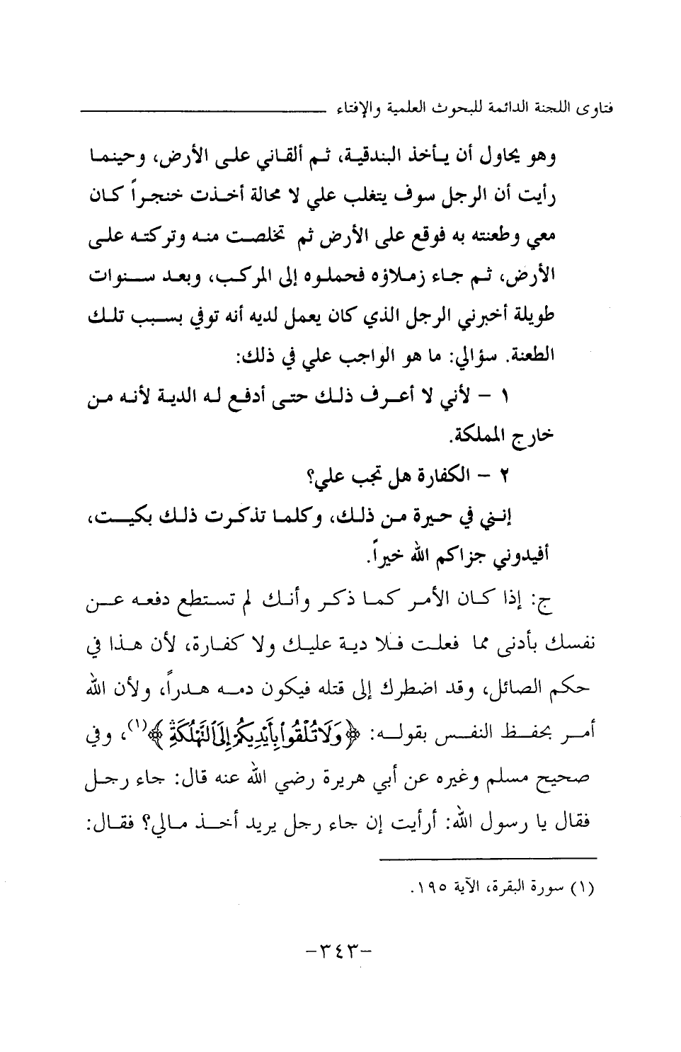 وهو يحاول أن يأخذ البندقية، ثم ألقاني على الأرض، وحينما رأيت أن الرجل سوف يتغلب علي لا محالة أخذت خنجرا كان معي وطعنته به فوقع على الأرض ثم تخلصت منه وتركته على الأرض، ثم جاء زملاؤه فحملوه إلى المركب، وبعد سنوات طويلة أخبرني الرجل الذي كان يعمل لديه أنه توفي بسبب تلك الطعنة. سؤالي: ما هو الواجب علي في ذلك: